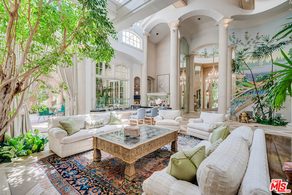 One of the largest villas in prestigious guard gated Century Woods Estates, custom designed to echo grand European architecture. In the vast two-story living room, well suited for lavish entertaining, Juliette balconies overlook a fountain, live trees and one of six fireplaces. Nearby are a library, formal dining room and a sunken bar opening to a private courtyard with pool and spa. The chefs kitchen links to a sunny breakfast room and butlers pantry. The primary bedroom suite, located on the first floor, features a fireplace, kitchenette, massive luxurious bathroom and star-quality walk in closet. An office, glamorous powder room and staff quarters complete the level. The second floor begins with two bedrooms, one currently used as a beauty salon. The expansive guest wing has its own staircase entrance opening to a large bedroom, spacious sitting room, spa shower, walk in closet, eat-in kitchen and patio overlooking the pool. Enjoy an elevator, two garages to house three cars and additional private parking for guests. The home is moments from Century City and Beverly Hills shopping, dining and entertainment. Amenities include 24-hour gated security, fitness center, two pools and spas (indoor and outdoor), tennis court and clubhouse. This is a coveted opportunity to transform this magical estate and make it your own!