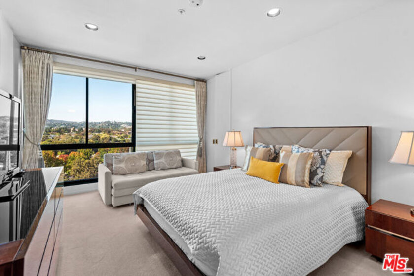 Experience luxury and comfort in this elegant 3 bedroom, 3 bath residence (currently being used as 2 + den) perched on the 12th floor of The Blair House, one of Wilshire Corridor's most desirable full-service buildings. Flooded with natural light, this spacious home showcases sweeping city and mountain views, including Century City, snow on the San Gabriel Mountains and Bel Air, through floor-to-ceiling windows, creating a serene and inspiring backdrop throughout. The formal dining area and generous living spaces are perfect for entertaining, complemented by timeless finishes and beautiful travertine marble floors. The expansive primary suite features a large bedroom, a spa-like bathroom, and a large walk-in closet. The second bedroom with ensuite bath, offers flexibility for guests, a home office, or den. Additional highlights include large laundry with lots of additional storage and 2 zones of heat and air. Unit 1206 comes with 3 deeded parking spaces. The Blair House offers an unparalleled lifestyle with 24-hour valet parking and security, Huge sparkling saline pool & spa on large pool deck featuring lots of comfortable seating and BBQs. A new huge fully equipped gym is currently under construction. Spacious rec room and north/south tennis court with lights complete the picture. This is better than living at The Four Seasons Hotel!