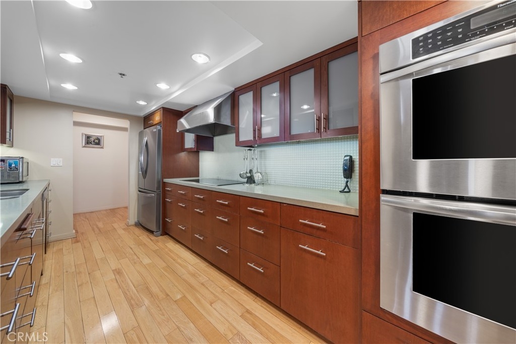 Prime Location on Wilshire Blvd - less than 5 minutes drive to UCLA! This is at the Wilshire Manning high rise towner with spacious and bright open floor plan. 3-bedroom, 3.5-bathroom condominium offering 2,426 sqft of open-concept living space on a single floor. This stunning unit features custom built-in wood and glass cabinetry in the living room, elegant wood flooring, recessed lighting, auto-switch blind curtain, and a modern kitchen equipped with stainless steel appliances. Enjoy breathtaking city lights views from the 6th floor private balcony, a generous dining area, and a roomy master suite complete with a walk-in closet and separate vanity area. Each bedroom is designed as a suite, providing privacy and comfort. Situated on the 6th floor of a full-service building managed by Wilshire Manning, residents have access to resort-style amenities including a recently remodeled gym, pool & spa, outdoor ping-pong table, and a social room. Additional perks include 24-hour security and valet parking for your convenience. Experience the ultimate Los Angeles lifestyle in this exceptional property — don't miss out!