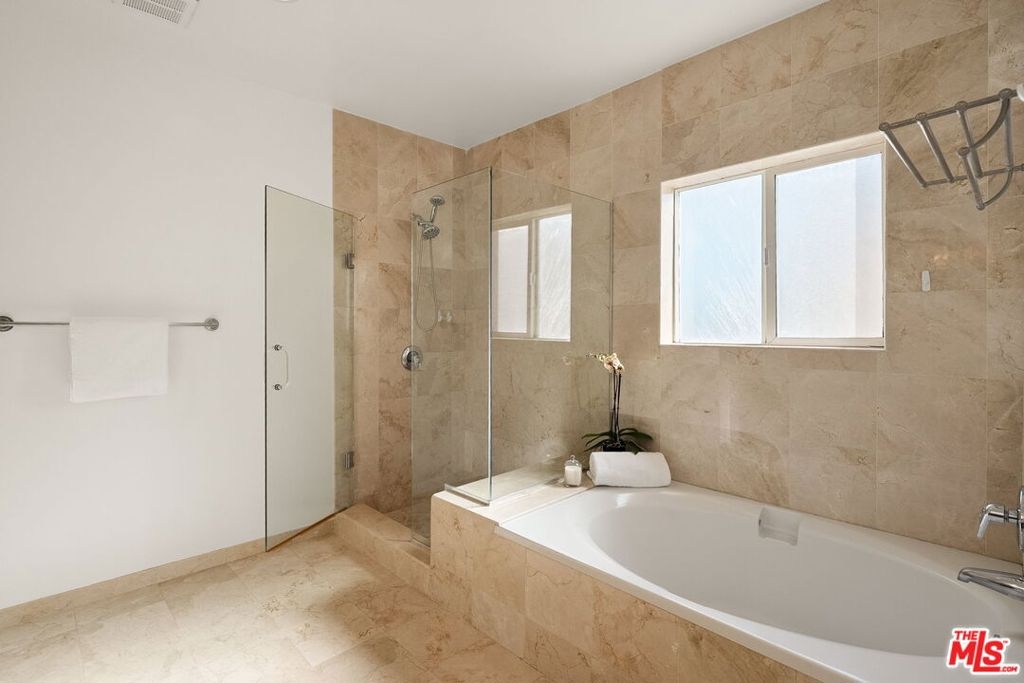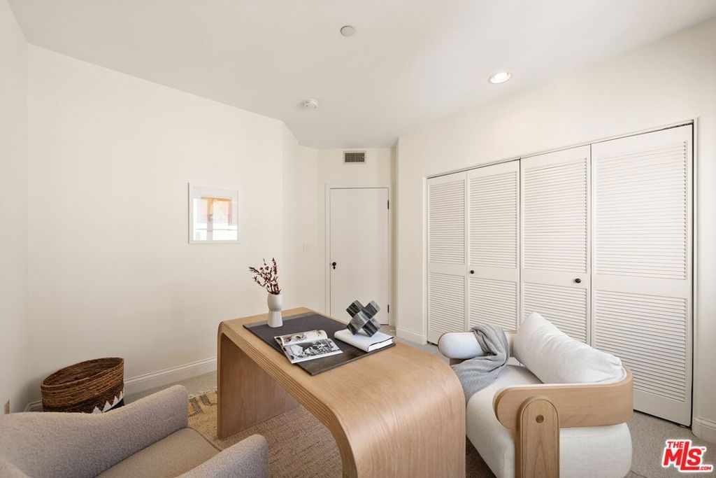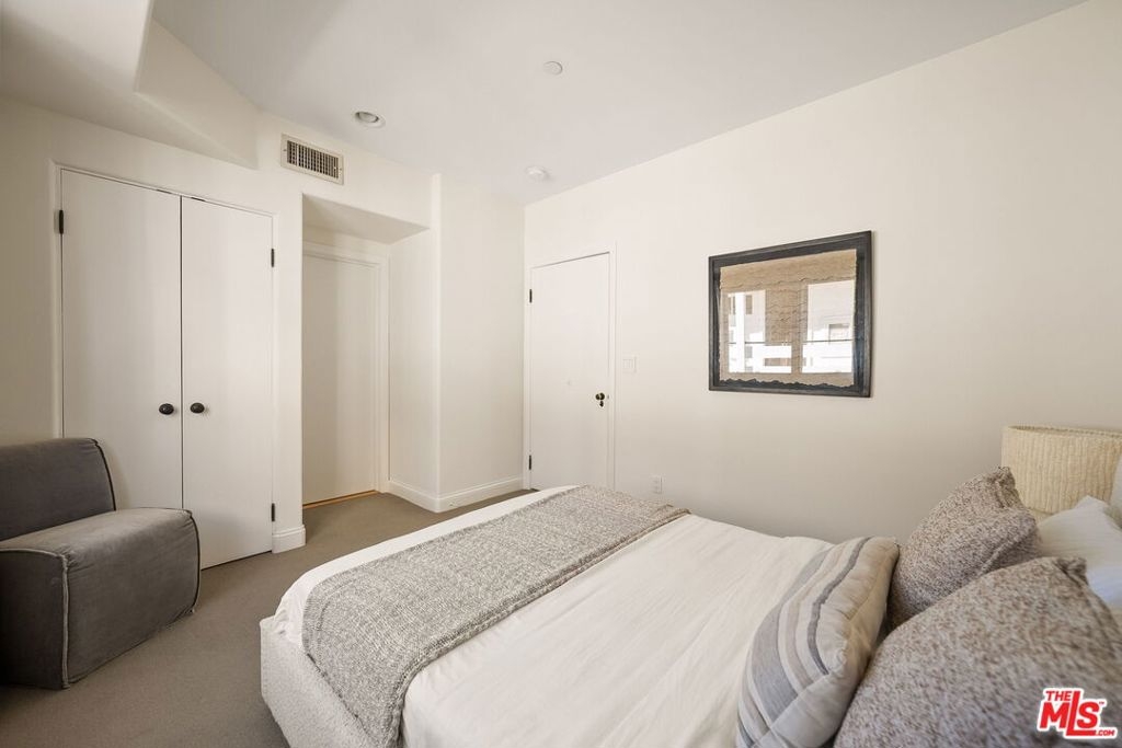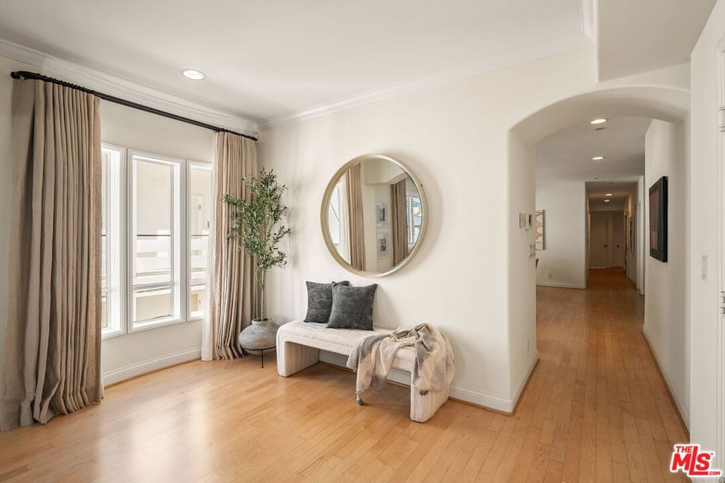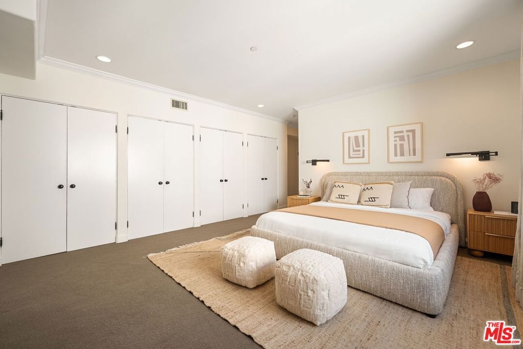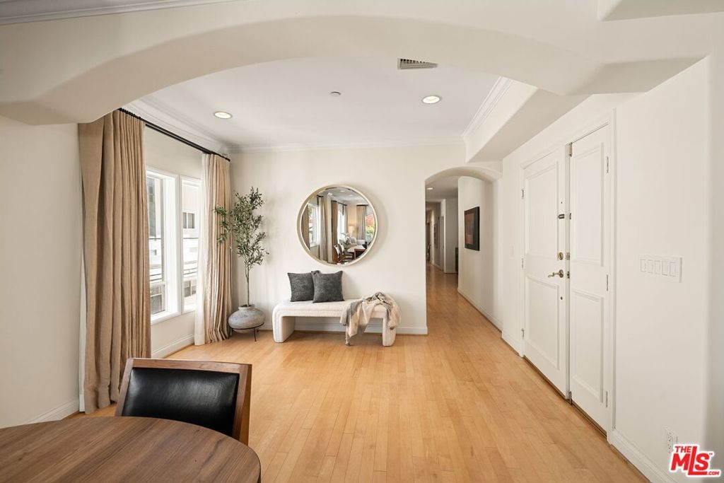 Luxurious, light, bright and spacious 3BR/2.5BA in the heart of Brentwood, just blocks from San Vicente and the Farmer's Market! Front facing with balcony, this designer DONE condominium feels like a single level home from the moment you enter. Large open living and dining room concept with recessed lighting, crown moldings, custom shelving and natural hardwood floors. Chef's kitchen with steel appliances connect to the family room with bar top and multiple eating areas. 3 bedrooms including the most divine and large primary suite with connecting spa like bathroom featuring a sunken tub, giant shower and double vanity sinks with granite countertops. Central Air/Heat and Laundry inside the unit. Controlled entry with security camera and intercom. In the gated garage, your two parking spots come with your own Tesla charging station. With only 8 units in the building makes this quiet and private retreat a wonderful place to call Home. An A+ gem and location in Brentwood. Must see!