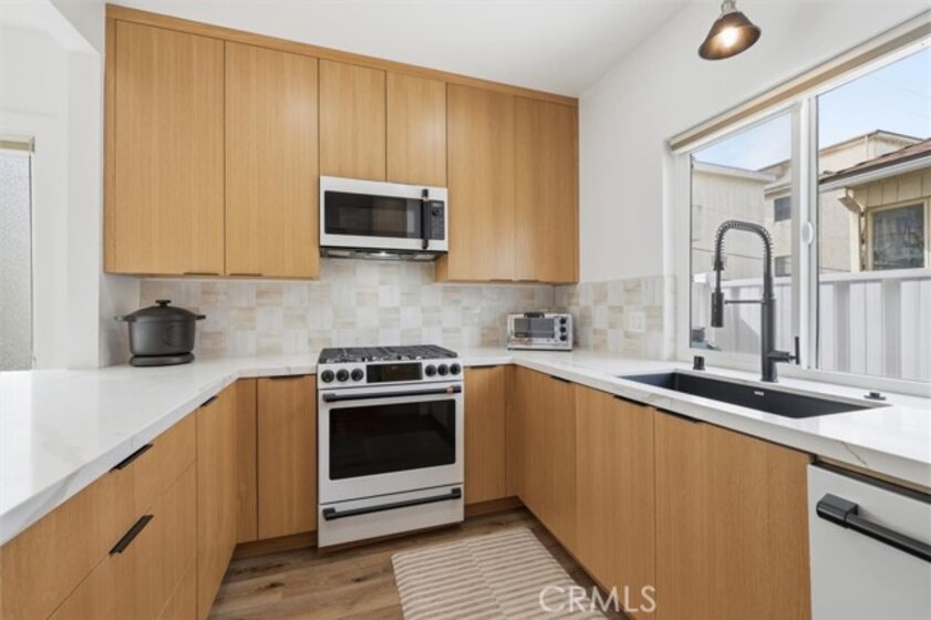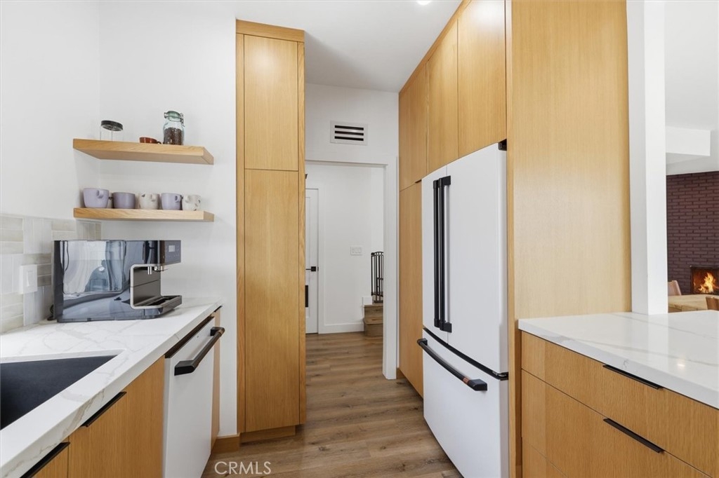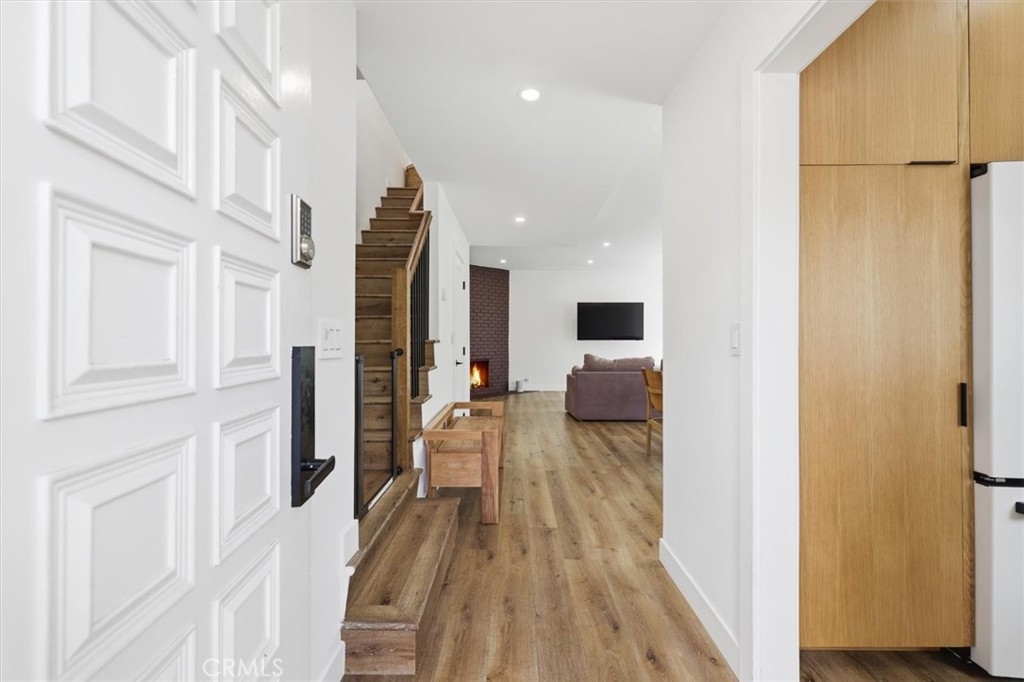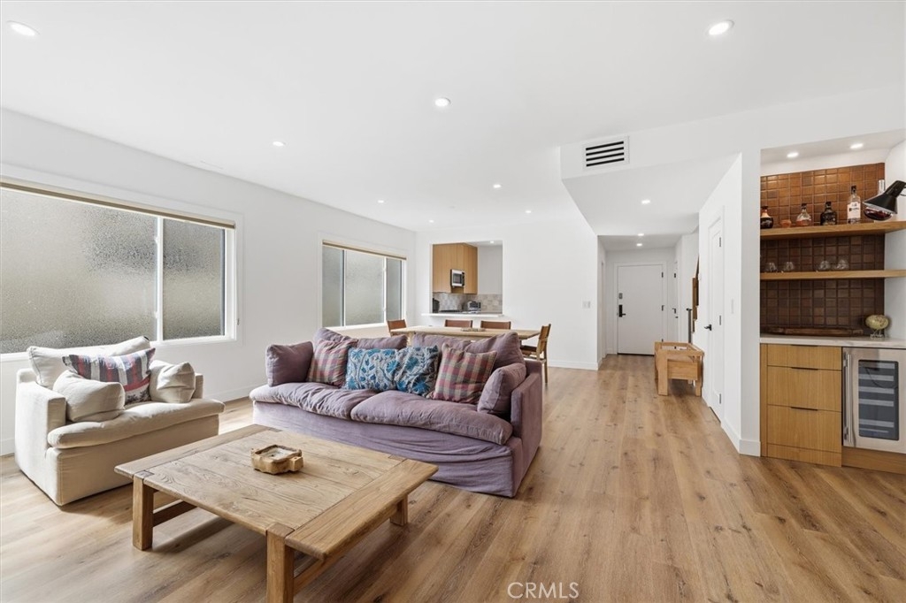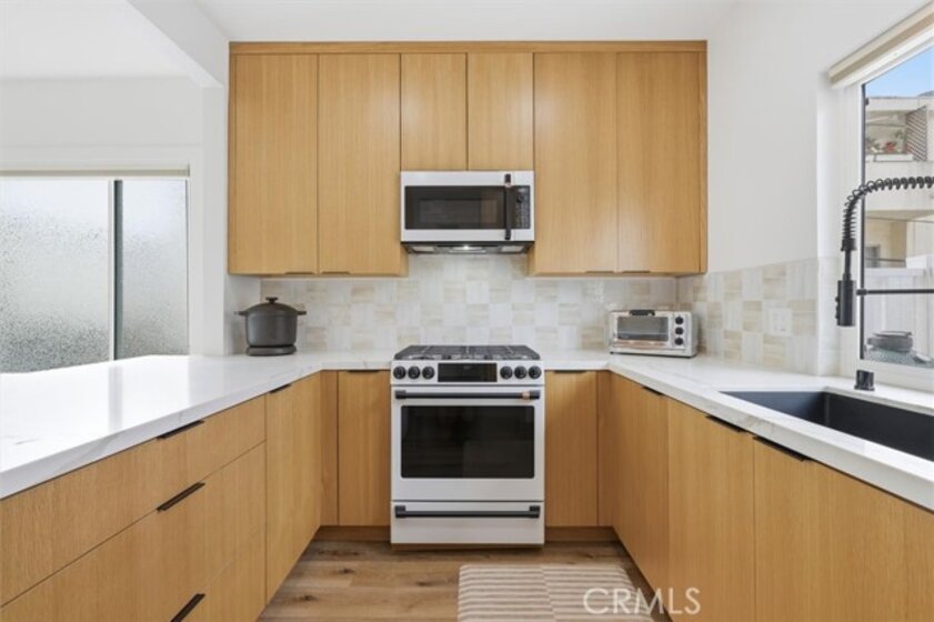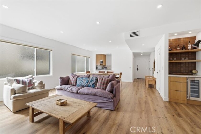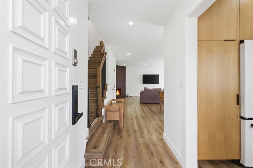 Completely remodeled with a focus on clean design and custom finishes, this 2-bedroom, 2.5-bath home offers a bright, open layout with abundant natural light and a true townhouse-style feel. The main level features wide plank engineered white oak flooring throughout, a spacious living and dining area with a gas fireplace, and a fully updated kitchen showcasing custom rift white oak cabinetry, quartz countertops, and Café appliances. A built-in dry bar with wine refrigerator adds both function and a thoughtful design element, along with a convenient updated powder room for guests. Upstairs, both bedrooms are en-suite, including a primary suite with vaulted ceilings, a walk-in closet, and a dual vanity bathroom with a separate tub and walk-in shower. The bathrooms have been fully remodeled with designer tile work, custom vanities, and updated fixtures. The secondary bathroom features a walk-in shower with full tile surround, glass enclosure, and modern finishes, while the secondary bedroom includes a custom Murphy bed, offering flexibility for guests or a home office. Additional features include a stackable washer and dryer upstairs, two tandem parking spaces, and a private patio enclosed with vinyl fencing, ideal for outdoor dining or BBQ. Located in a well-maintained 6-unit building just moments from Brentwood’s shops and restaurants along San Vicente and Montana Avenue.