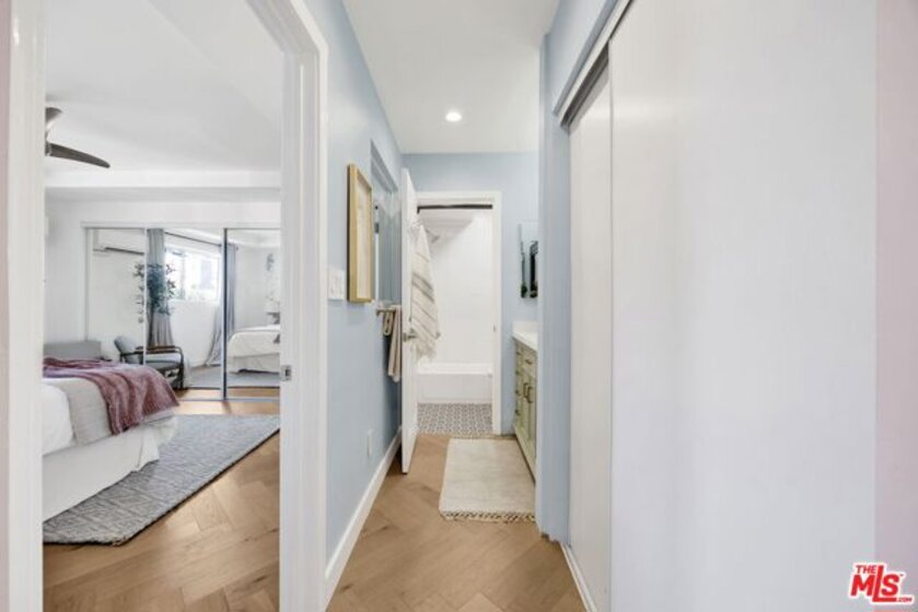 Welcome to this beautifully remodeled 1-bedroom, 1-bathroom condo offering a stylish blend of modern updates and functional design. The open layout is filled with natural light and features herringbone hardwood floors, a convenient study nook, and recessed lighting. The updated kitchen is complete with newer cabinets, stainless steel appliances (refrigerator, dishwasher, microwave, and electric stove), and a reverse osmosis water filtration system. The bathroom showcases Neo-Moorish tile, a modern vanity, and a TOTO toilet with bidet attachments. Additional upgrades include in-unit laundry, new A/C split systems, a designer ceiling fan, and a coffered ceiling in the bedroom. A private balcony provides an outdoor extension of the living space. Located in the heart of Hollywood, with a partial view of the iconic Hollywood Sign landmark, this residence offers proximity to dining, entertainment, and shopping.