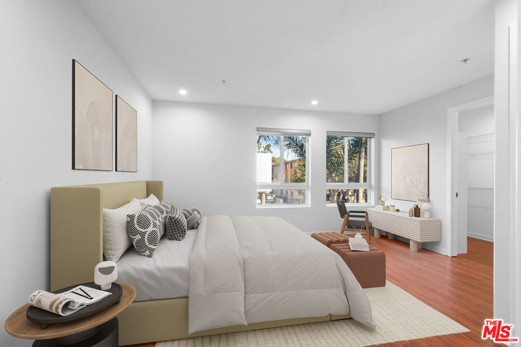 Beautifully maintained 2007-built South-East corner unit offering a bright, spacious layout with 3 bedrooms, 2 full bathrooms, and 9 ft ceilings. The open-concept living area features mahogany wood floors, crown molding, and a dining space that flows into the updated kitchen with customized wood cabinetry, granite countertops, stainless steel appliances, and a convenient breakfast bar. The generous primary suite includes a large walk-in closet, additional sliding closet, and an ensuite bath with dual vanities. In-unit laundry is located in the hallway. Additional highlights include newer recessed lighting, updated doors, central HVAC, and excellent storage including a large private Storage unit in the garage. The building provides a recreation room, guest parking, controlled access, and tranquil courtyard spaces. Two assigned tandem parking spaces in a secure gated garage with EV charging station. Low HOA dues including EQ insurance. Prime Korea-town location near cafes, restaurants, markets, and easy access to the 10 freeway.