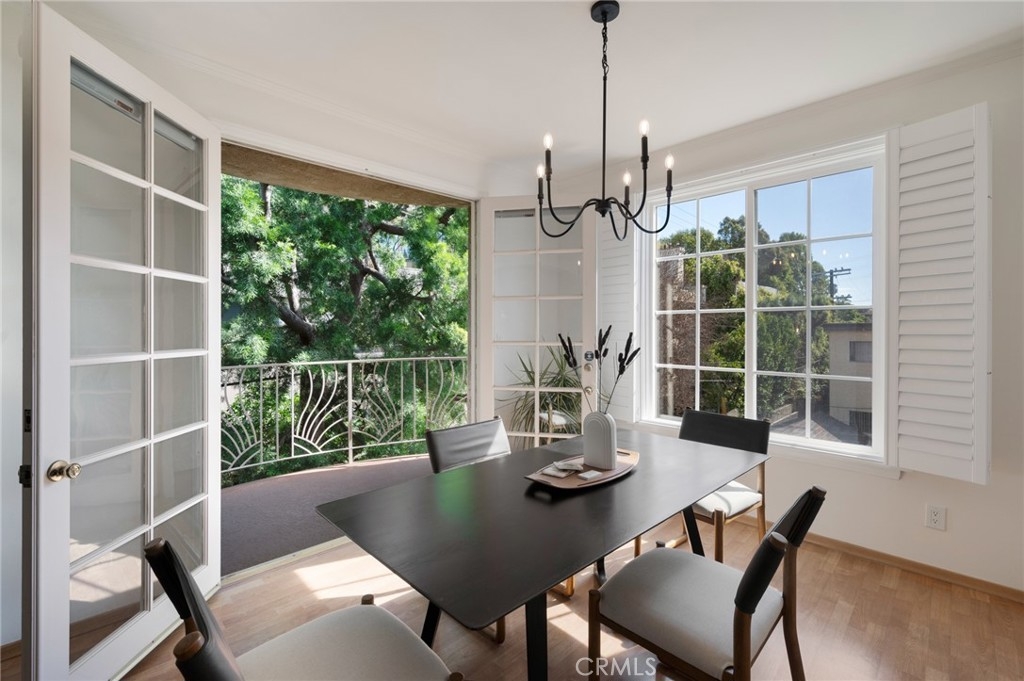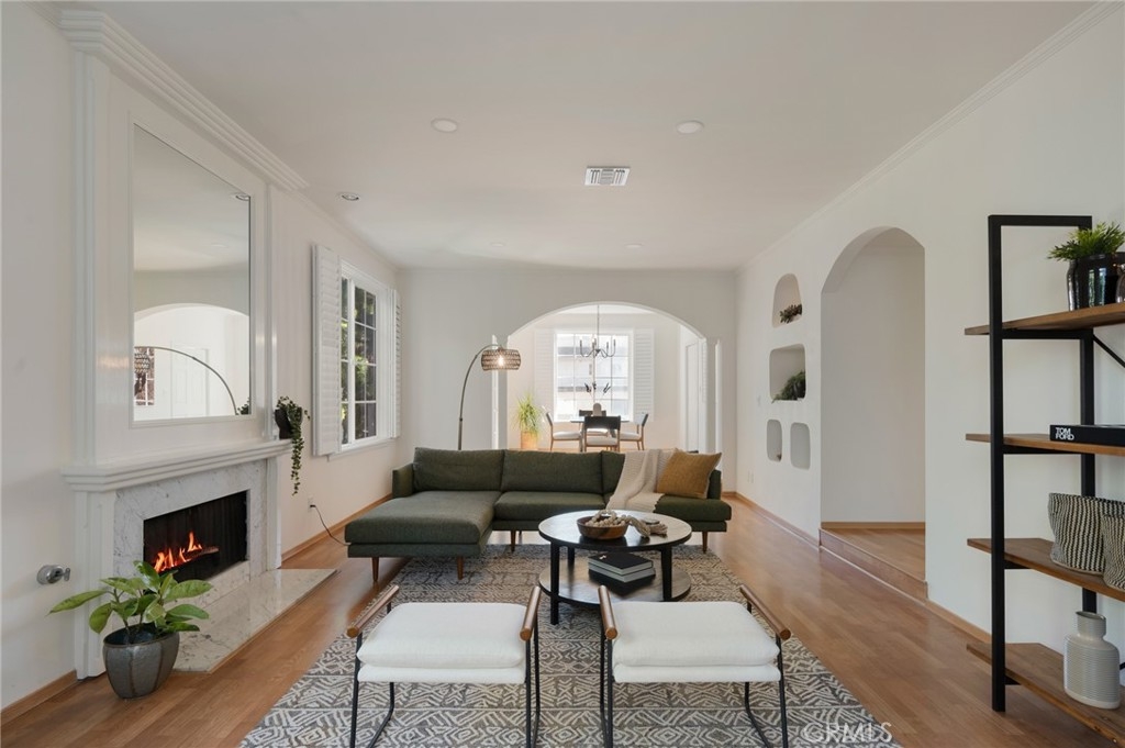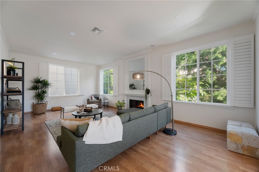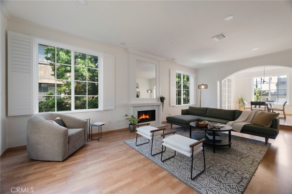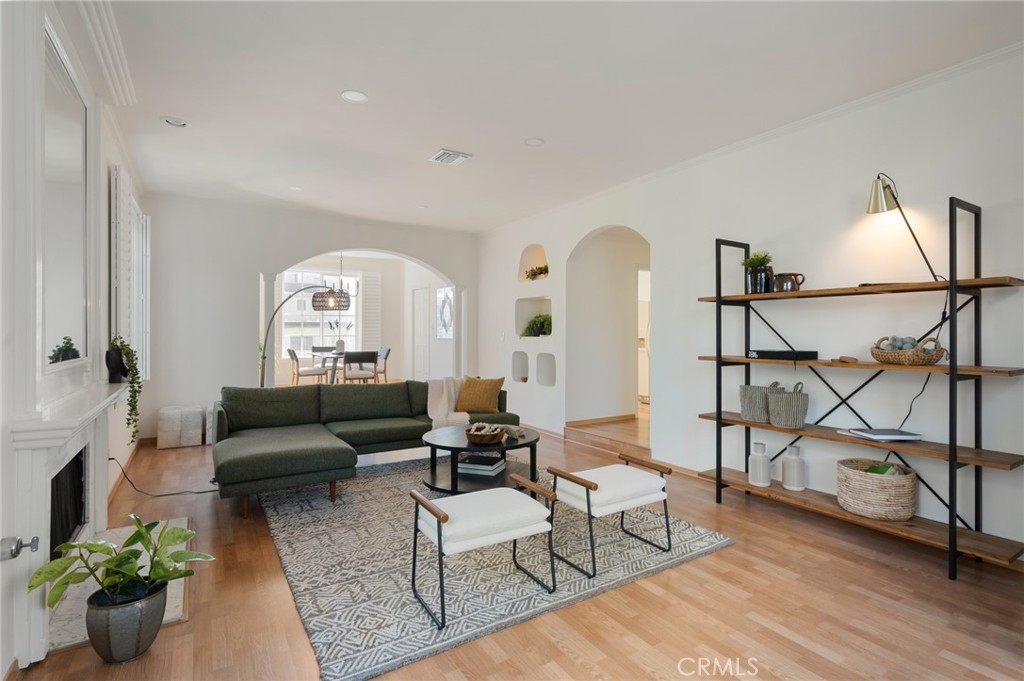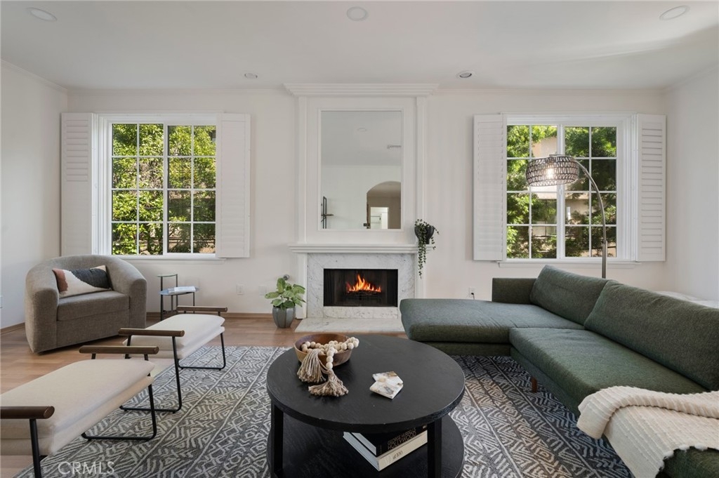 Tucked away at the end of a charming, tree-lined cul-de-sac, this beautifully updated rear corner residence offers the perfect blend of privacy, space, and refined comfort. Situated within an intimate six-unit building, this expansive 2-bedroom, 2-bath condo spans approximately 1,573 square feet. Step inside to soaring 10-foot vaulted ceilings, rich hardwood floors, and an elegant fireplace that anchors the sophisticated living room. French windows fill the home with exceptional natural light, enhancing the warmth and openness of the space. Crown moldings, recessed lighting, and custom built-ins add timeless character and thoughtful detail throughout. The formal dining room flows seamlessly from the kitchen to a private balcony, creating a welcoming indoor-outdoor ambiance. Designed with both functionality and connection in mind, the spacious eat-in kitchen offers abundant cabinetry, generous prep space, and ample room to gather. Whether entertaining guests or enjoying a quiet evening at home, this thoughtfully designed space balances any occasion. Both bedrooms are impressively proportioned, offering comfort and versatility, and are enhanced with custom built-ins that provide stylish appearance, and efficient storage solutions. The expansive primary suite is a true retreat—generously scaled to accommodate a sitting area and complemented by a large walk-in closet designed to meet all your wardrobe needs. Completing the home, both bathrooms have been tastefully renovated with quality finishes and refined details, delivering a fresh, modern aesthetic feel. Additional features include in-unit washer and dryer, abundant storage, garden & rooftop deck access, and the rare advantage of a location at the back of the property—providing exceptional peace and privacy. Ideally and centrally located just minutes from Westwood, UCLA, Century City, and access to the 405, this home offers effortless convenience to the very best of everything while remaining discreetly tucked away from it all.