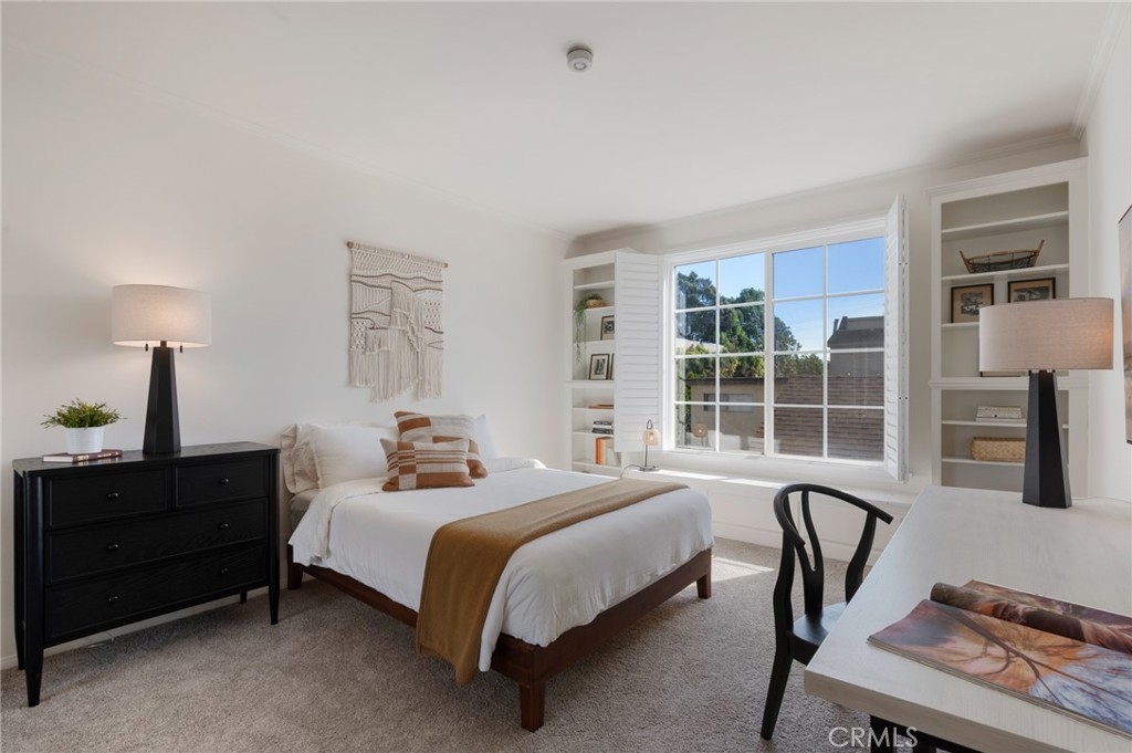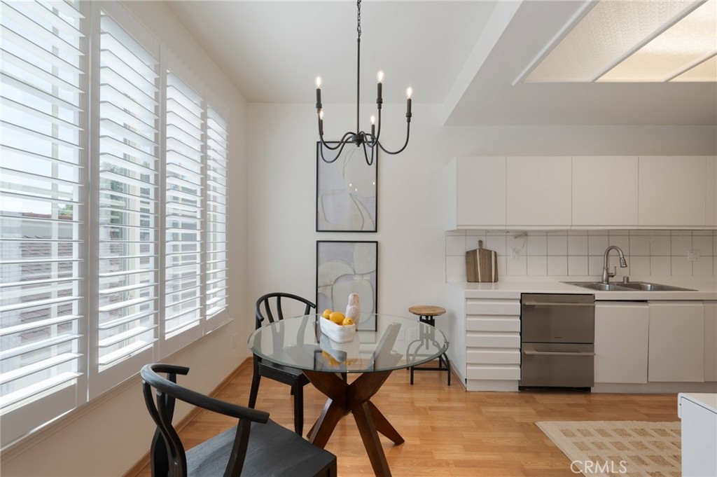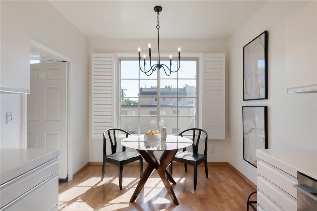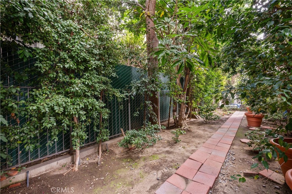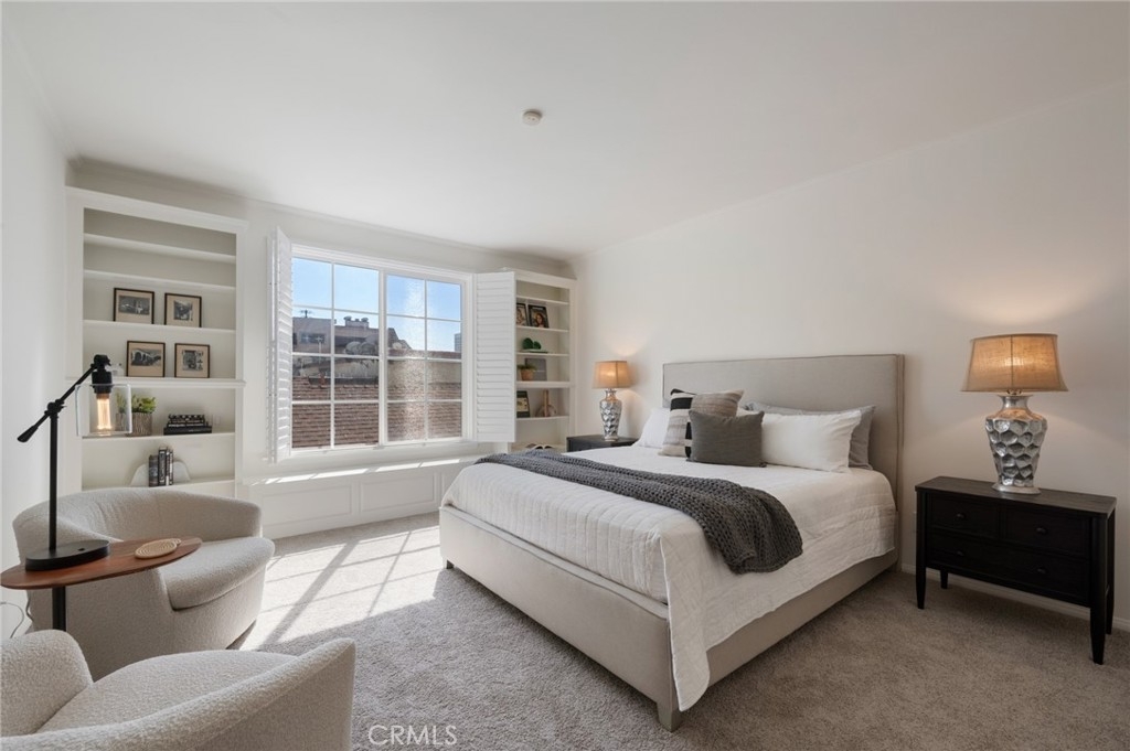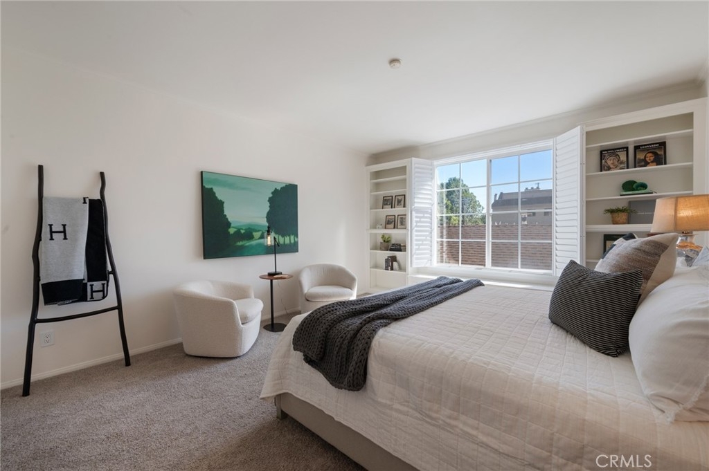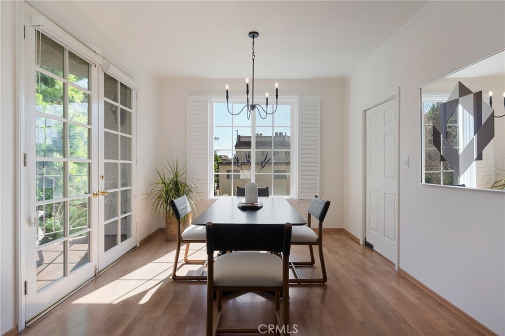 Tucked away at the end of a charming, tree-lined cul-de-sac, this beautifully updated rear corner residence offers the perfect blend of privacy, space, and refined comfort. Situated within an intimate six-unit building, this expansive 2-bedroom, 2-bath condo spans approximately 1,573 square feet. Step inside to soaring 10-foot vaulted ceilings, rich hardwood floors, and an elegant fireplace that anchors the sophisticated living room. French windows fill the home with exceptional natural light, enhancing the warmth and openness of the space. Crown moldings, recessed lighting, and custom built-ins add timeless character and thoughtful detail throughout. The formal dining room flows seamlessly from the kitchen to a private balcony, creating a welcoming indoor-outdoor ambiance. Designed with both functionality and connection in mind, the spacious eat-in kitchen offers abundant cabinetry, generous prep space, and ample room to gather. Whether entertaining guests or enjoying a quiet evening at home, this thoughtfully designed space balances any occasion. Both bedrooms are impressively proportioned, offering comfort and versatility, and are enhanced with custom built-ins that provide stylish appearance, and efficient storage solutions. The expansive primary suite is a true retreat—generously scaled to accommodate a sitting area and complemented by a large walk-in closet designed to meet all your wardrobe needs. Completing the home, both bathrooms have been tastefully renovated with quality finishes and refined details, delivering a fresh, modern aesthetic feel. Additional features include in-unit washer and dryer, abundant storage, garden & rooftop deck access, and the rare advantage of a location at the back of the property—providing exceptional peace and privacy. Ideally and centrally located just minutes from Westwood, UCLA, Century City, and access to the 405, this home offers effortless convenience to the very best of everything while remaining discreetly tucked away from it all.