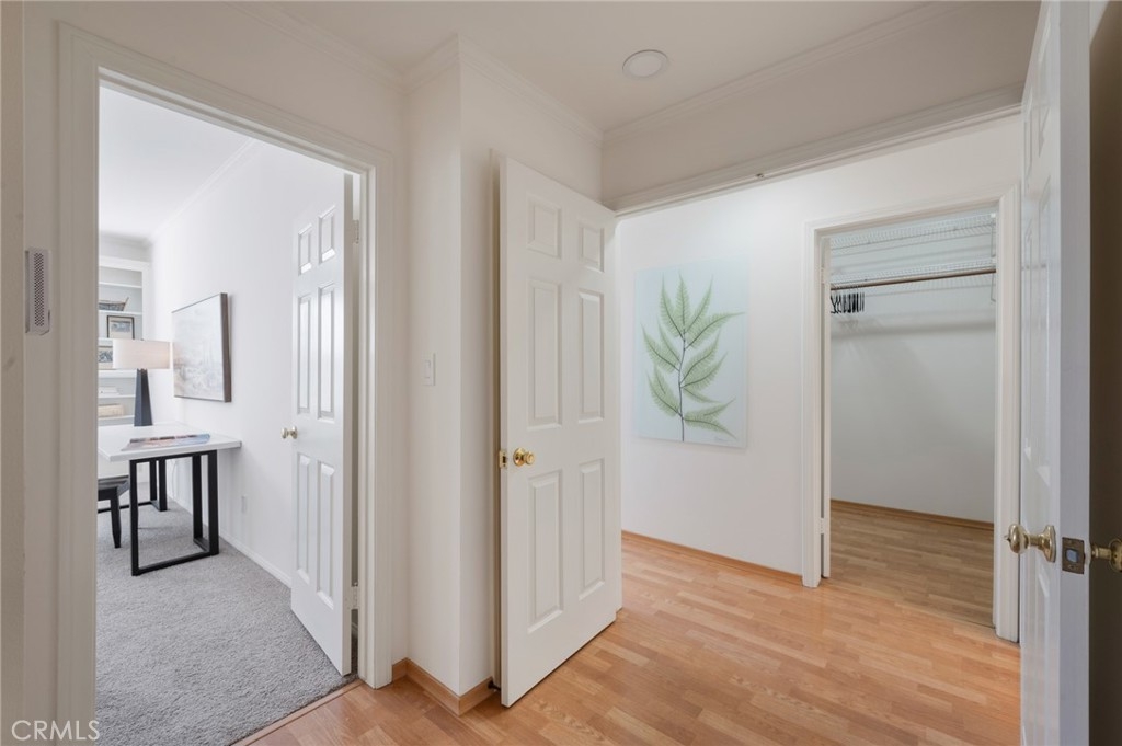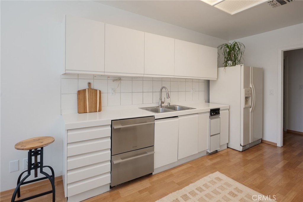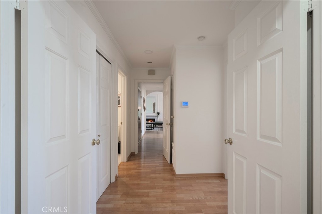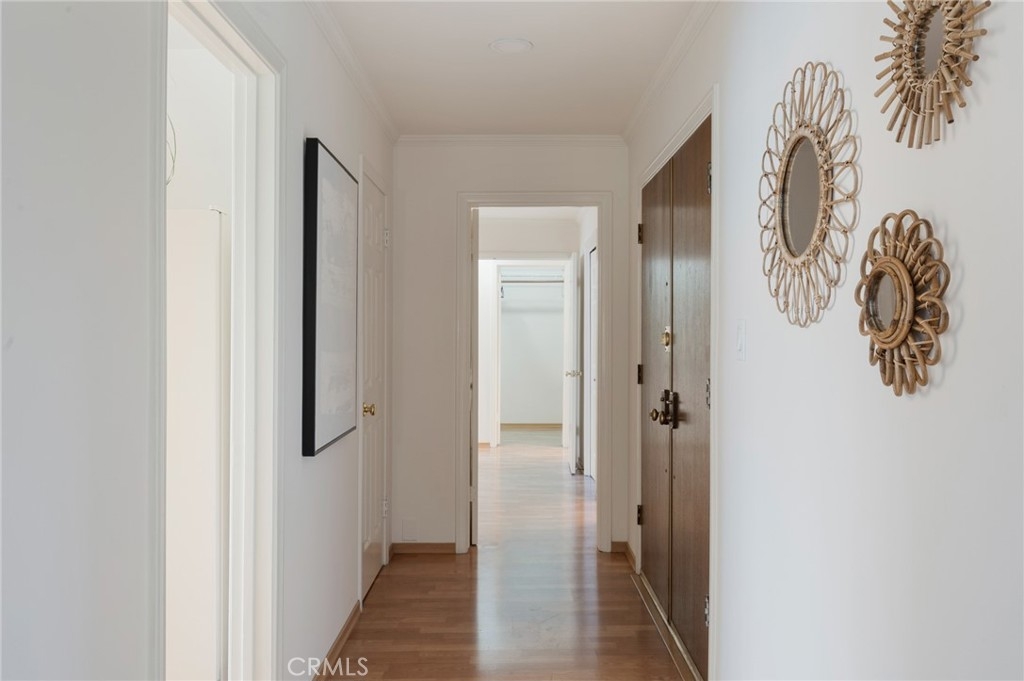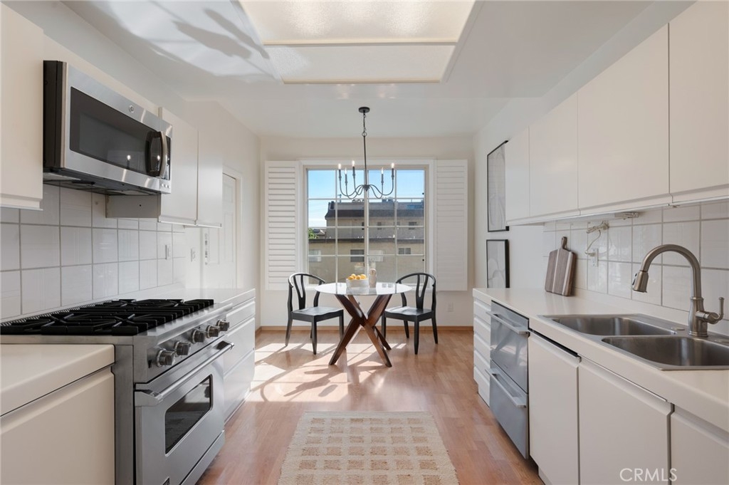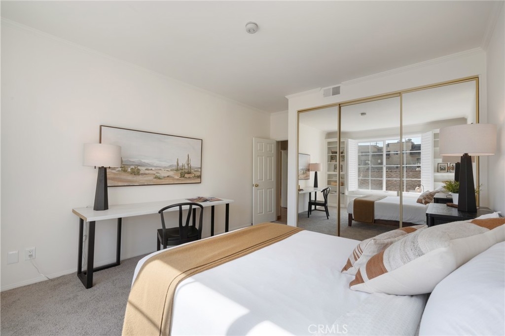 Tucked away at the end of a charming, tree-lined cul-de-sac, this beautifully updated rear corner residence offers the perfect blend of privacy, space, and refined comfort. Situated within an intimate six-unit building, this expansive 2-bedroom, 2-bath condo spans approximately 1,573 square feet. Step inside to soaring 10-foot vaulted ceilings, rich hardwood floors, and an elegant fireplace that anchors the sophisticated living room. French windows fill the home with exceptional natural light, enhancing the warmth and openness of the space. Crown moldings, recessed lighting, and custom built-ins add timeless character and thoughtful detail throughout. The formal dining room flows seamlessly from the kitchen to a private balcony, creating a welcoming indoor-outdoor ambiance. Designed with both functionality and connection in mind, the spacious eat-in kitchen offers abundant cabinetry, generous prep space, and ample room to gather. Whether entertaining guests or enjoying a quiet evening at home, this thoughtfully designed space balances any occasion. Both bedrooms are impressively proportioned, offering comfort and versatility, and are enhanced with custom built-ins that provide stylish appearance, and efficient storage solutions. The expansive primary suite is a true retreat—generously scaled to accommodate a sitting area and complemented by a large walk-in closet designed to meet all your wardrobe needs. Completing the home, both bathrooms have been tastefully renovated with quality finishes and refined details, delivering a fresh, modern aesthetic feel. Additional features include in-unit washer and dryer, abundant storage, garden & rooftop deck access, and the rare advantage of a location at the back of the property—providing exceptional peace and privacy. Ideally and centrally located just minutes from Westwood, UCLA, Century City, and access to the 405, this home offers effortless convenience to the very best of everything while remaining discreetly tucked away from it all.