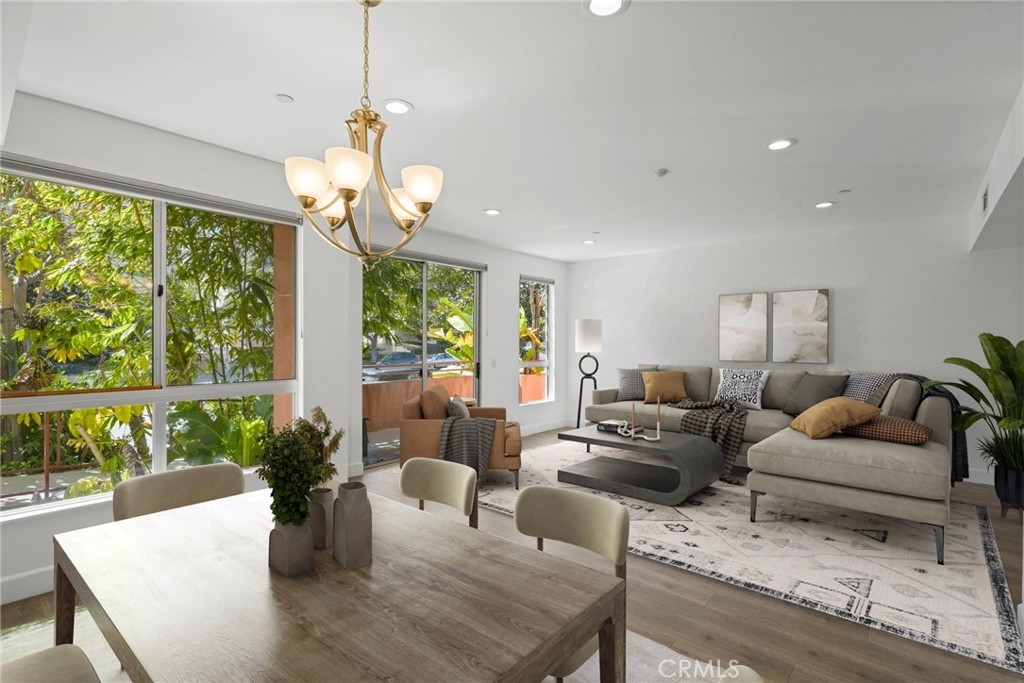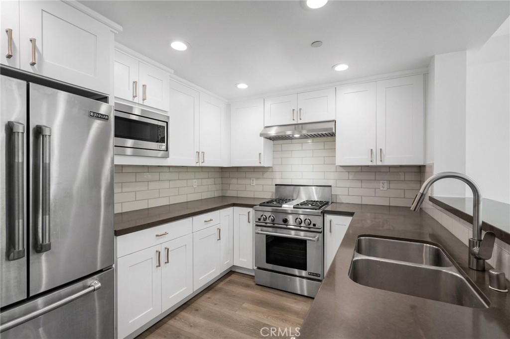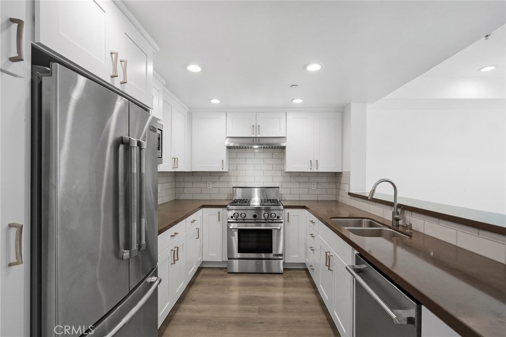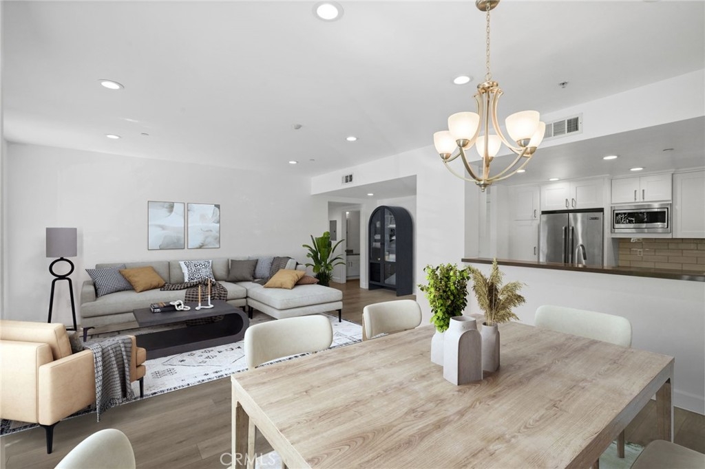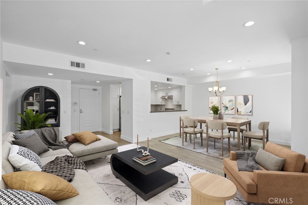 WELCOME TO THE GLEN TERRACE! This Luxurious 2 Bed | 2 Bath condo with open floor plan is ready for you to call home. As you enter, you are welcomed to the grand foyer with high ceilings, you will immediately notice the gleaming laminate flooring and natural light flow throughout the home's open, airy layout. The large living room with balcony is ideal when entertaining guests. The inviting top-of-the-line gourmet kitchen is clad with premium finishes including Caesar-stone countertops, custom white cabinetry, Mosaic glass backsplash, Jenn-Air stainless range, refrigerator, microwave, dishwasher and a breakfast bar that opens up to the dining area. Two bedrooms which include a Primary en-suite with dual sliding mirrored door closets with built-ins, a Primary Bath with dual sinks, natural stone counters, large soaking tub and a separate walk-in shower. Other features include Washer, dryer in unit, the unit is pre-wired for an alarm and CAT-5 ethernet in each room. Glen Terrace HOA covers water and trash. Secured underground parking with EV fast charge outlet (240 volt) in stall (2 tandem spaces). Guest parking spots available and storage room in garage. Walking distance to Westfield Century City Mall, offices, shops and restaurants. Minutes from UCLA. Westwood Charter School district. The unit has been virtually staged with furniture.