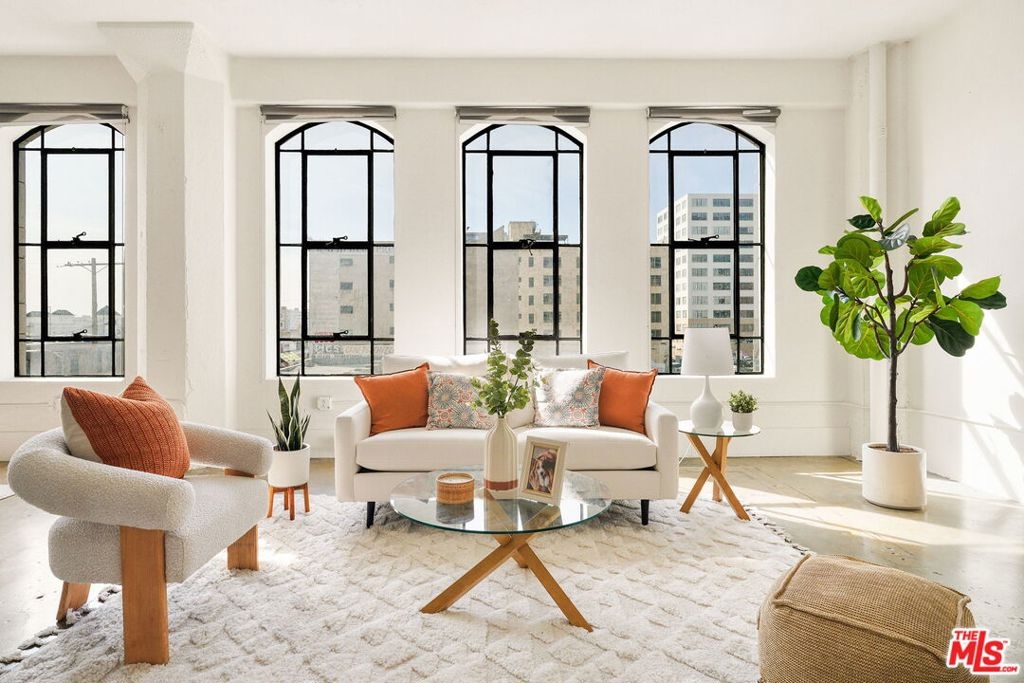 Welcome to a historic and architectural corner loft. With only 1 shared wall, the airy and sunbathed New York-style loft boasts an open floor plan with a separate bedroom area. The loft features 6 original steel-framed arched casement windows, tall gallery walls and cement floors. The kitchen is modern and spacious. A large bathroom with a soaking tub and washer/dryer combo. Bonus! A custom built closet that runs full length for plenty of storage space. As part of the unique urban community of Santee Village, amenities to complement your lifestyle, whether you wish to unwind or entertain, include the following: Sun decks, BBQ grills, gym, rooftop basketball court, small driving range, community pool and spa - with 360 degree views of Los Angeles.Listed on the National Register of Historic Places, the Textile Building is a boutique, 12-story, 69-unit Gothic Revival Landmark overlooking the Fashion District in Downtown L.A. Listed under the Mills Act - earning homeowners generous savings on property taxes. The Mills Act automatically transfers to the new homeowner. Rare! A dedicated parking space within the complex PLUS a storage unit in the basement included. Located in the Flower District, in the heart of Downtown Los Angeles. Within walking distance to award winning restaurants, museums and coffee shops. Across the street from the Netflix featured Sonoratown. A stone's throw away to the Metro Station, Whole Foods, L.A. Live, Crytpo Arena and freeways. Truly, a unique urban dwelling experience.