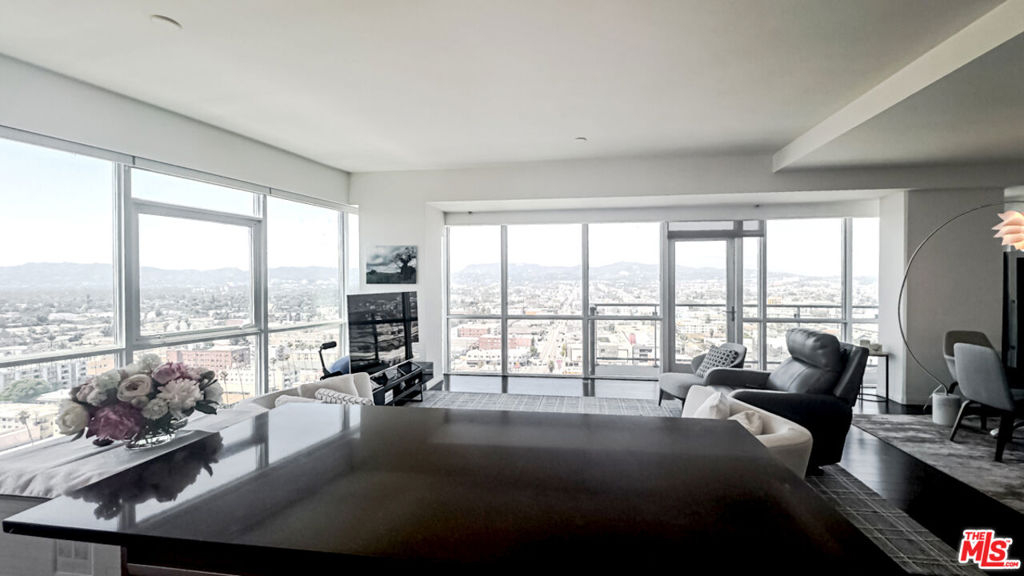 High-rise Luxury Living in Wilshire/Western Historic Intersection. Prime Korea Town Location!. This stunning modern 2 bed 3 bath residence is situated in the heart of Korea Town. Positioned at the Northwest corner of the 22nd floor, just below the Penthouse, this unit offers breathtaking views of the Los Angeles skyline, spectacular sunsets, and sparkling city lights. The modern open floor plan maximizes natural light, highlighting the elegant hardwood floors. The wrap-around private balcony provides an unobstructed view of iconic landmarks such as the Hollywood sign, West Hollywood, Green Mountain, and the Griffith Park observatory, creating a serene private oasis. The expansive living room features newly renovated window coverings and floor-to-ceiling windows, serving as a captivating focal point. The gourmet kitchen is beautifully appointed with contemporary fixtures, including a sizable island, quartz countertops, hardwood cabinets, and stainless steel appliances. The crystal clear windows invite abundant sunlight into the interiors. The SOLAIR community offers premium amenities including 24/7 concierge and controlled access, a high-end sky deck with a pool and cabanas, a function room for parties, a gym, a conference room, a business center, a coffee room, and full-time building maintenance. It is also a pet-friendly environment. The unit includes private storage and two side-by-side assigned parking spaces. Conveniently located near Hancock Park, Larchmont Village, Wilshire Country Club, Korea Town DLTA, The Grove, Beverly Hills, and public transit, this home offers luxurious living in a tranquil setting away from high-traffic areas.