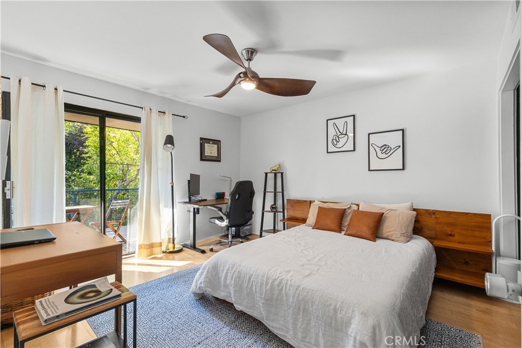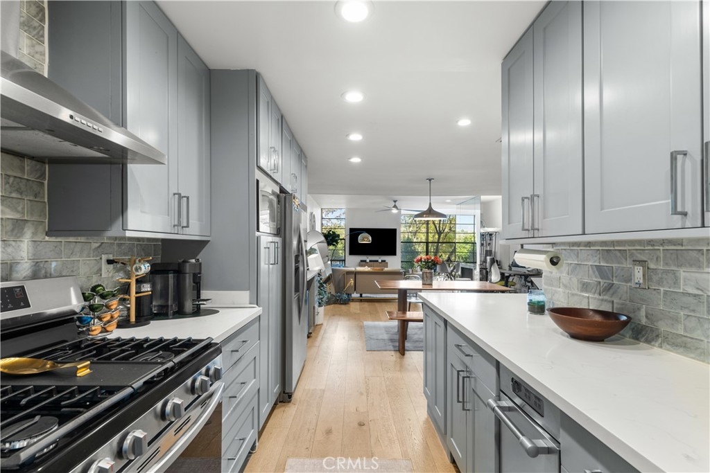 Welcome to this move-in ready architectural condo in the gated Skyline Townhome community, which was designed by noted architect Lorenzo Tedesco. Step inside to a light and airy open floor plan where floor-to-ceiling steel-framed windows and stunning floors create an atmosphere of warmth and sophistication. The seamlessly connected living and dining areas flow effortlessly into a remodeled kitchen, boasting sleek stone countertops, stainless steel appliances and ample storage space. Upstairs you’ll find two generously sized bedrooms and two tastefully updated bathrooms, including a luxurious primary suite that boasts a well-appointed ensuite bathroom. Additional highlights include in-unit laundry, two spacious balconies, a community pool/spa and two side by side parking spaces within the secured community garage. Centrally located between the Valley, Westside and Downtown LA, this property is just moments from the Hollywood Bowl, Universal Studios, Ventura Boulevard's vibrant shopping/dining scene and so much more.