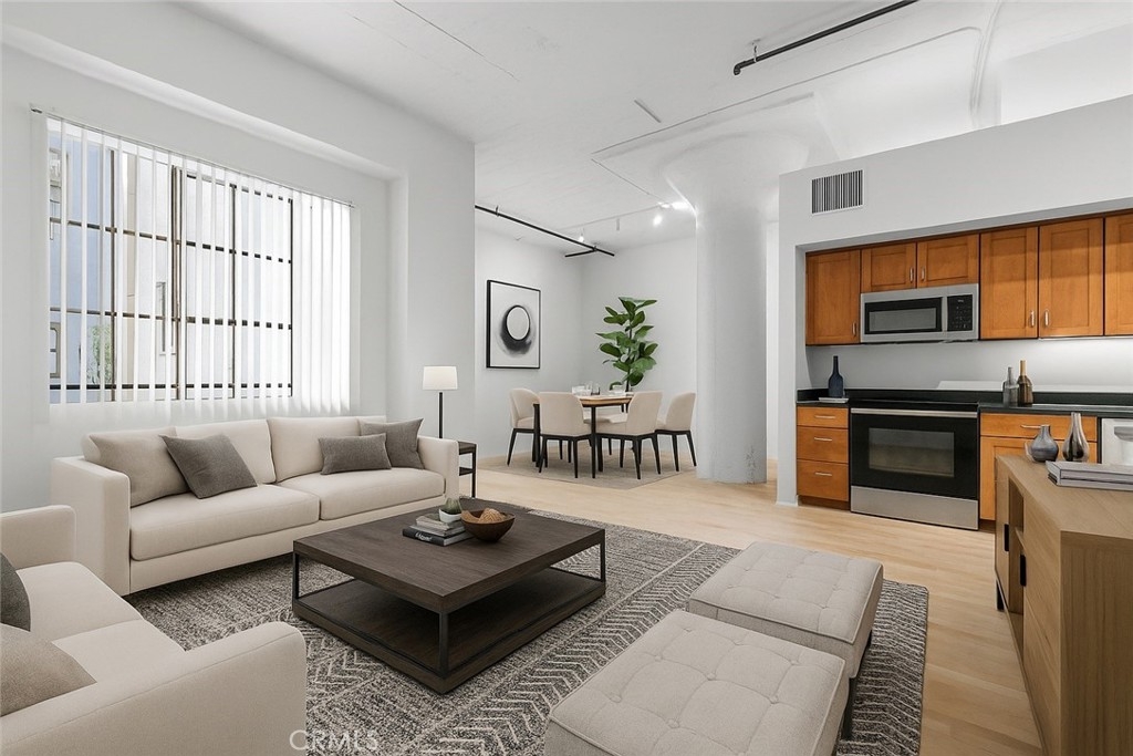 The live/work loft at Little Tokyo Lofts features a one-of-a-kind floor plan that offers defined living areas while maintaining the open loft aesthetic. Soaring ceilings, expansive windows, hardwood floors, and a remodeled kitchen, along with a large walk-in closet. The unit includes a refrigerator, washer, and dryer. Originally built in the 1920s as the historic Westinghouse Electric elevator factory, Little Tokyo Lofts was transformed into stylish condominiums in 2005. Residents enjoy resort-style amenities including a heated pool and spa, BBQ area, gym, dog run, 24-hour security, and secure parking with one assigned space plus guest parking in the garage.The community has a welcoming, small-town feel and is just a five-minute walk from the heart of Little Tokyo.