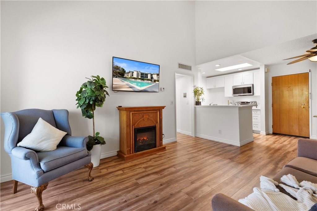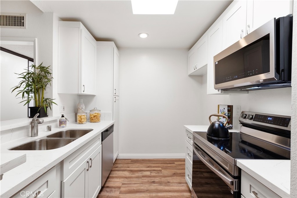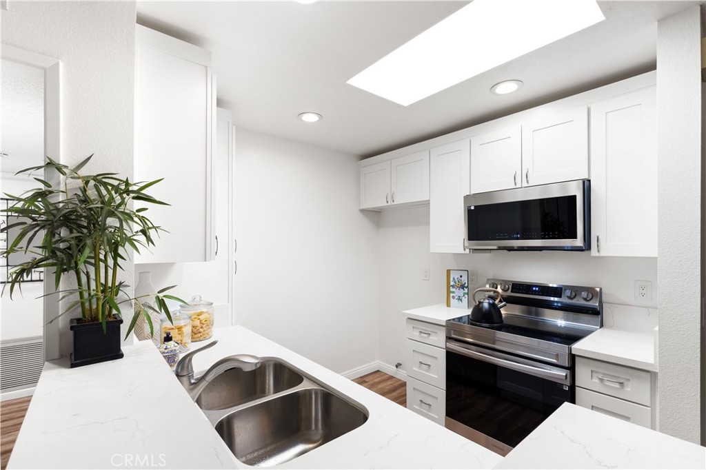 Welcome Home! Tucked away at the top of Monterey Hills, this beautifully updated 1-bedroom, 1-bathroom condo offers the perfect blend of comfort, style, and privacy. With an open floor plan, high ceilings, and abundant natural light from two skylights, a large slider, and generous window, this home feels spacious, bright, and inviting. Step onto your private, secluded balcony and enjoy tranquil views of the hillside and surrounding trees—where squirrels and birds make regular appearances. Inside, you’ll find ample storage with multiple closets and thoughtfully designed upgrades throughout.The recently fully renovated kitchen features sleek quartz countertops, cabinets with soft-close hinges and pull-out pantry drawers, as well as brand-new appliances including a range, microwave, dishwasher, and garbage disposal. The bathroom has been stylishly upgraded with tile flooring, a modern shower/tub combo, new fixtures, and a new toilet. Bathroom is large and spacious with its own skylight, his and her vanity and very large mirror. Some additional highlights include; recently installed vinyl flooring throughout, AC and heating system, ceiling fans in multiple rooms, floor to ceiling window with a beautiful view in the spacious bedroom. This unit includes 2 gated parking spaces, building storage, visitor parking, and plenty of street parking. The community offers a large swimming pool, spa, and plenty of space to lounge with a view of the hill side. Located just minutes from local restaurants, shops, and everything Northeast LA has to offer, this is an ideal place to call home.