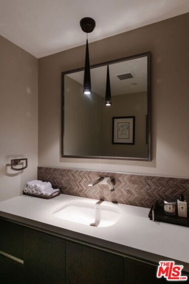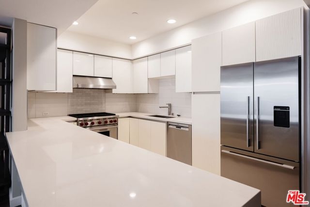 Experience elevated Brentwood living in this refined residence within a full-service luxury building. The Cosmopolitan BW offers 24/7 concierge and a full-service front desk, and is home to an elegant 2-bed, 2.5-bath residence with a spacious open layout, intentional accent lighting, wide plank oak wood floors, and expansive windows. The generous living space extends to a small private balcony and a sizable dining area that can comfortably seat up to eight. The gourmet kitchen features top-of-the-line stainless-steel Fisher & Paykel and Bosch appliances, a Wolf range, sleek white cabinetry, a large island with bar seating, and ample counter space. An in-unit washer/dryer adds everyday convenience. Both bedrooms include ensuite baths, while the primary suite elevates comfort with a soaking tub, dual vanities, and a large walk-in closet. Residents enjoy premium amenities including a state-of-the-art fitness center, heated pool, outdoor lounge with fire pit, and a tranquil meditation garden.Just moments from top-rated schools, acclaimed restaurants, boutique shopping, and the iconic Brentwood Country Mart, this home offers a sophisticated and effortless Brentwood lifestyle.