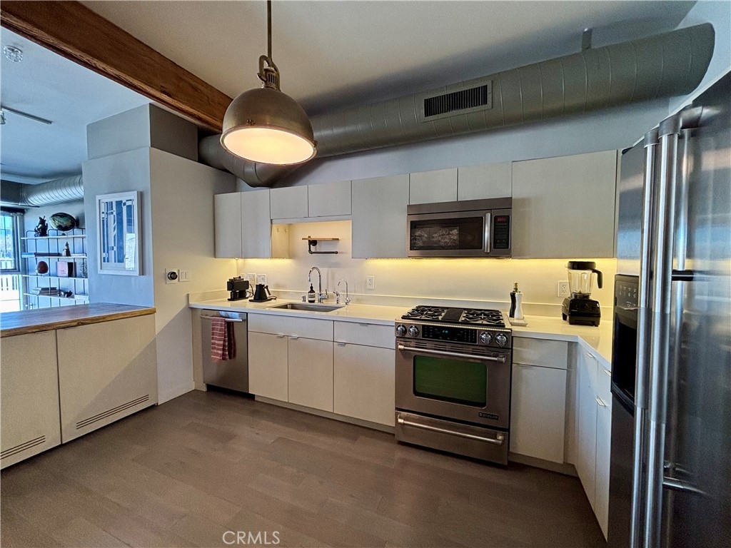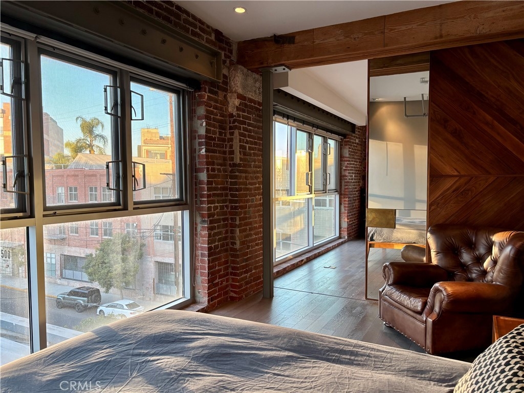 Experience urban sophistication in the historic Arts District of LA. This light-filled corner penthouse remodeled by Hughes Umbanhowar Architects blends industrial loft modernism with all the warmth and comforts of home. Barker Block is the standard of style in downtown LA living, and unit 401 is in its own class. This 1,710 square foot loft with 2 bedrooms and 2 full baths offers exposed brick, steel beams, 10-foot ceilings, pull-out pantry, and steam shower. The rooftop deck has cinematic city views and sunsets, a hot tub, pool, and barbecue. This pet-friendly building's amenities include 24-hour security, a gym, private parking, and common gardens with a fire pit. UNIT 401 has additional storage in building! Step outside to experience what TimeOut Magazine crowned the coolest neighborhood in LA, with some of the city’s best restaurants, cafes, breweries, and shops at your doorstep.