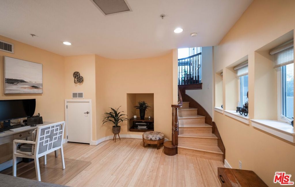 Aggressive price drop - best value in PV! Welcome home to this artful retreat. Private and light filled corner townhome that feels like a single family home, complete with private garage. Ideally located within Playa Vista, just steps away from a dog park and perfectly tucked away childrens park. The configuration of this home fills it with natural light, green top views and privacy. Walk into a sun-drenched living room with wood floors, a fireplace, and impressive high ceilings. The heart of the home is the natural wood kitchen complete with granite countertops, stainless appliances, and a generous sized breakfast nook, along with french doors that open to a tranquil balcony. Take the light soaked stairs to the top level and enjoy the generous primary bedroom with treetop views, a fireplace, and its own balcony. Boasting a large walk in closet, high ceilings, and a spa-like primary bathroom with separate tub and large shower. On the same level is a junior bedroom with an attached full bath. Lower level of the townhome offers a bonus room, a separate laundry room, and a private garage. Large crawl space/storage off the bonus room provides tons of storage space.