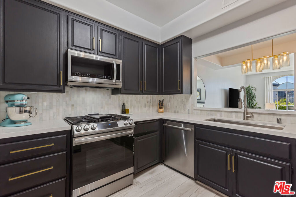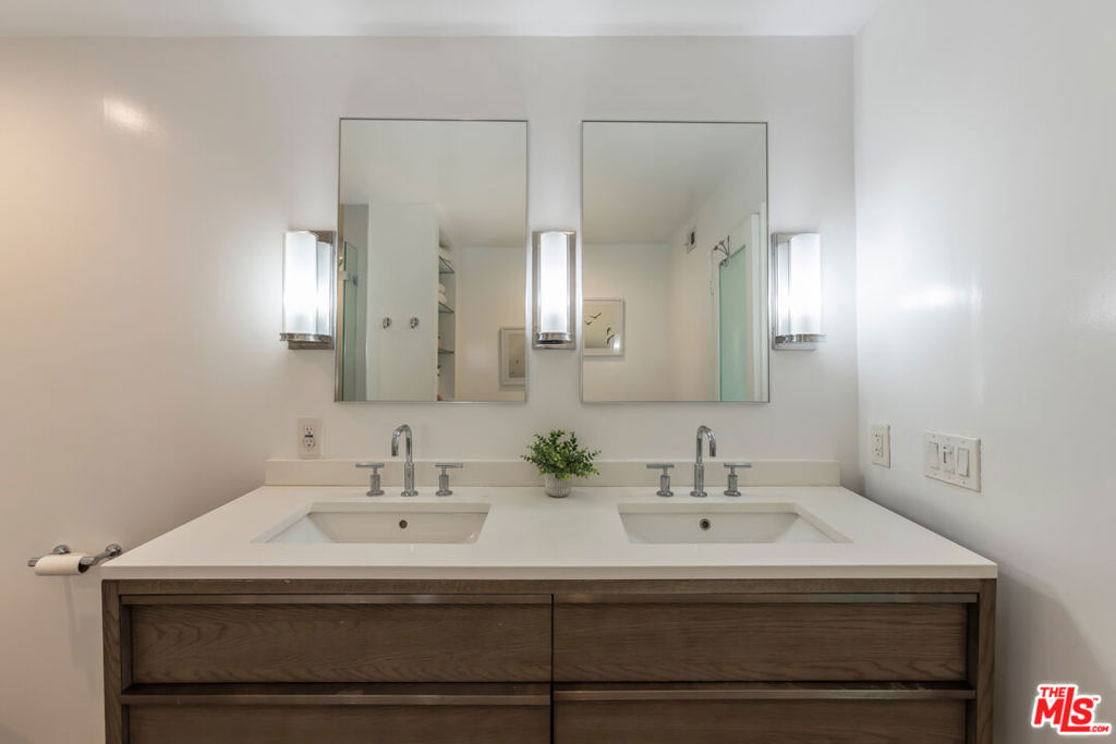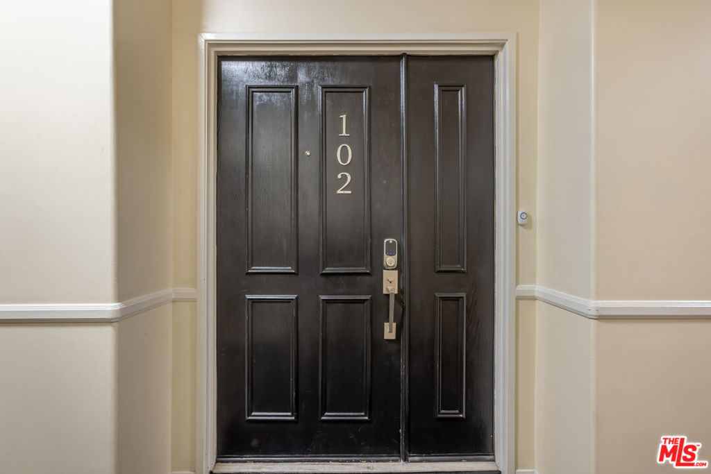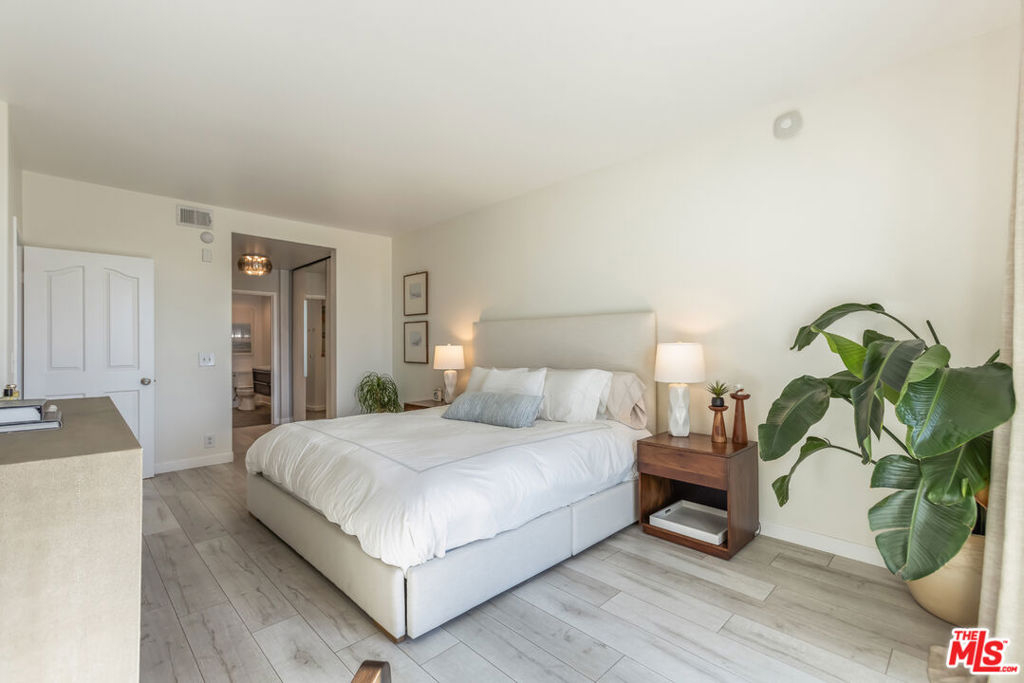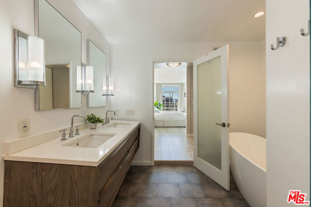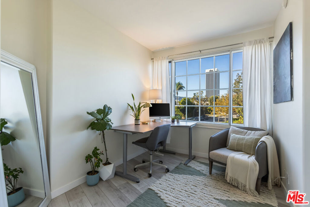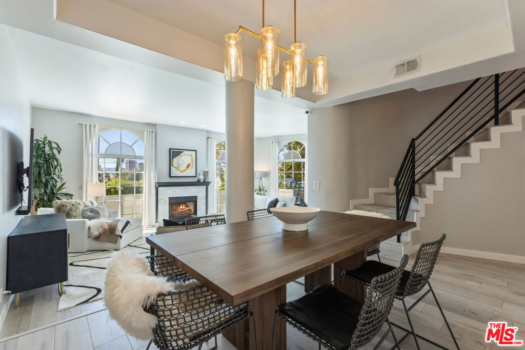 The one you have been waiting for. California casual sophistication defines this highly desired corner residence, showcasing gleaming plank flooring throughout, soaring ceilings, recessed lighting, and an abundance of natural light. Enter through the inviting foyer into the dedicated dining area, highlighted by an impressive tray ceiling and custom light fixture, which flows seamlessly into the expansive main living space. Here, an elegant marble fireplace with wood mantle, convenient wet bar with shelving, and dramatic floor-to-ceiling glass doors open to a collection of intimate balconies perfectly merging indoor and outdoor living. The well-appointed kitchen boasts considerable cabinetry, stainless steel appliances, and a wine refrigerator, while a chic powder room completes the main level. Upstairs, the serene primary suite offers a spacious bedroom, stylish closet, and dazzling ensuite bath with dual vanity, deep soaking tub, and separate shower. A comfortable sunlit second bedroom provides ample storage, while the third bedroom offers flexible potential as an office, den, or guest space. Both are serviced by a sizable hall bathroom with sleek vanity and tub-shower combination. A dedicated laundry room with full-size side-by-side washer and dryer, upper cabinetry, and additional hallway linen storage complete the second level. Perfectly situated near the Miracle Mile, LACMA, The Grove, Century City, Beverly Hills, and more, this residence places renowned dining, shopping, and entertainment right at your doorstep.