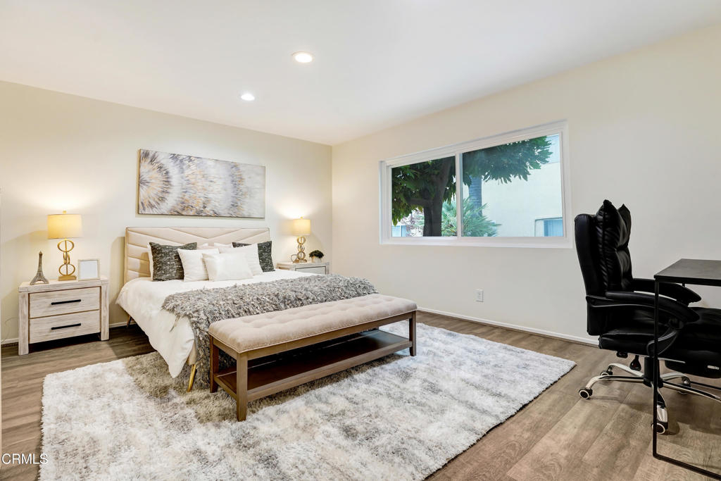 Nestled in the heart of North Hollywood, this beautifully updated first-floor 3-bedroom, 2-bathroom condo offers a bright, modern living space with generous room to relax, entertain, and enjoy community amenities. The expansive living room welcomes you with recessed lighting, warm wood-style flooring, and an open layout that easily accommodates multiple seating areas. Large windows bring in natural light, highlighting the inviting atmosphere and seamless flow into the dining area. The remodeled galley kitchen is a standout, featuring crisp white shaker cabinetry, sleek quartz countertops, stainless steel appliances, and ample storage--perfect for home chefs who value both style and functionality. Convenience is unmatched with this unit's ideal location right next to the community laundry room, making daily routines effortless. The home's spacious primary bedroom offers a peaceful retreat with room for a sitting area or workspace, while the additional bedrooms provide flexibility for guests, family, or office needs. Both bathrooms have been tastefully updated with modern vanities, elegant fixtures, and clean finishes. Step outside and enjoy one of the community's best features--the sparkling pool is located just steps from your door, creating a resort-like experience right at home. Lush landscaping and inviting outdoor seating areas complete the setting, offering plenty of space to unwind and soak up the California sun. With thoughtful updates, a highly desirable first-floor location, and easy access to the energy of the NoHo Arts District, this condo perfectly blends comfort, convenience, and contemporary style into a move-in-ready North Hollywood gem.