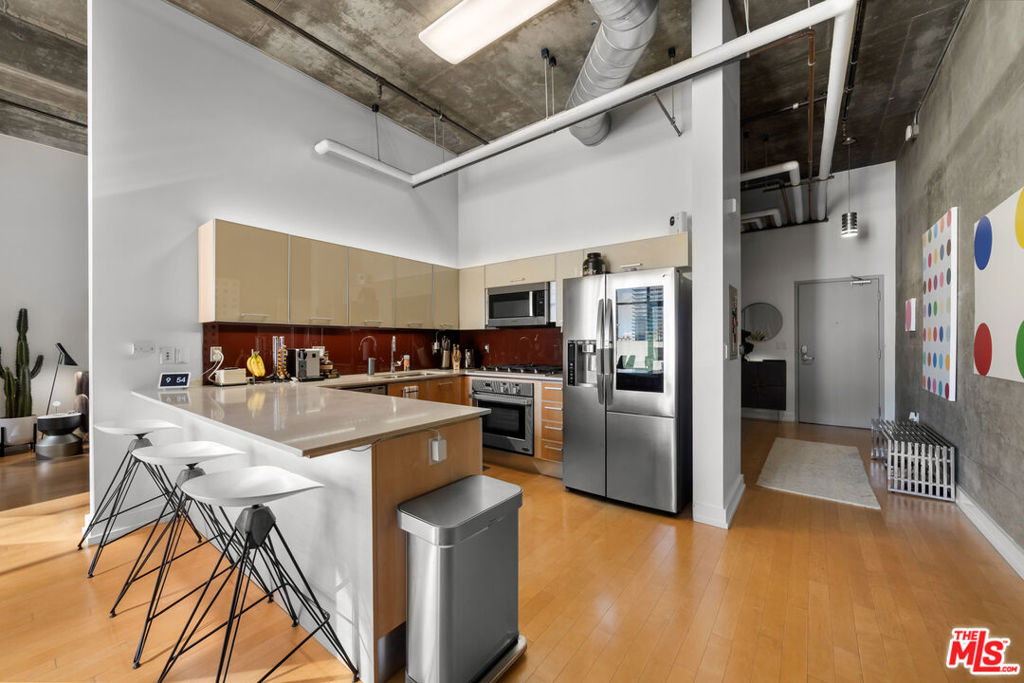 Don't miss this rare chance to own a highly sought-after top-floor Penthouse loft with soaring 14' ceilings and abundant natural light. The expansive floor-to-ceiling windows showcase breathtaking panoramic views of the DTLA skyline - Arguably the finest in the building. Step into an impressive entryway featuring a tall, exposed concrete wall, perfect for showcasing your art collection. This space seamlessly flows into a spacious living area and a sleek modern kitchen equipped with top-of-the-line stainless steel appliances, Caesarstone countertops, glass backsplash, and elegant European cabinetry. The bedroom area is generously sized, offering ample space for an office area that also benefits from the stunning city views. Adjacent to the bedroom, you'll find a luxurious bathroom and an expansive walk-in closet. An additional storage closet at the entryway provides a convenient solution for shoe and coat storage. For your convenience, the unit includes a BOSCH in-unit washer and dryer, along with a dedicated parking space. Located in the vibrant heart of DTLA you're just two blocks away from four grocery stores, popular restaurants, bars, and trendy shops. Residents enjoy exclusive amenities such as 24-hour security, a swimming pool and spa, a clubhouse, a BBQ area, a movie screening room, a fitness center, and onsite management. *** HOMEADVANTAGE QUALIFIED PROPERTY *** This property offers exclusive access to the HomeAdvantage program. Qualified buyers may achieve SUBSTANTIAL monthly payment savings* Listing agent has program specialist contact details - ask today!* Subject to buyer qualification. Matterport 3D Virtual Tour: https://my.matterport.com/show/?m=ogqu6aUor4e