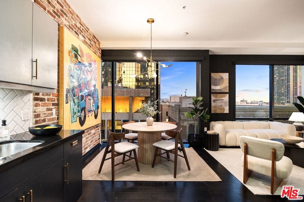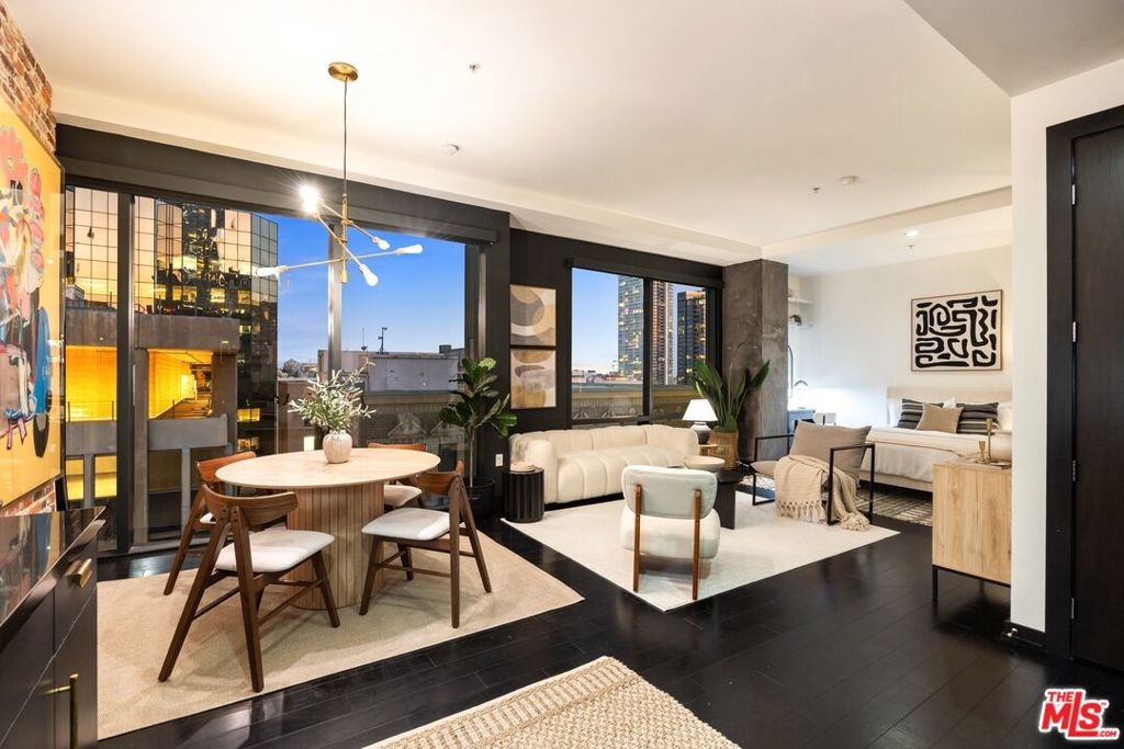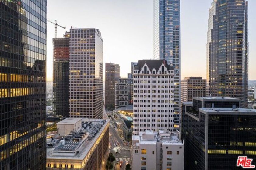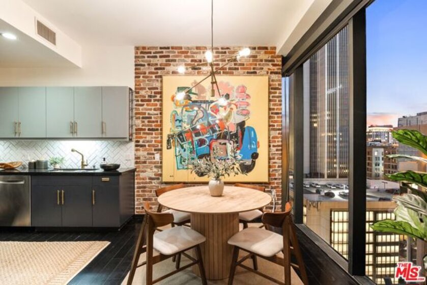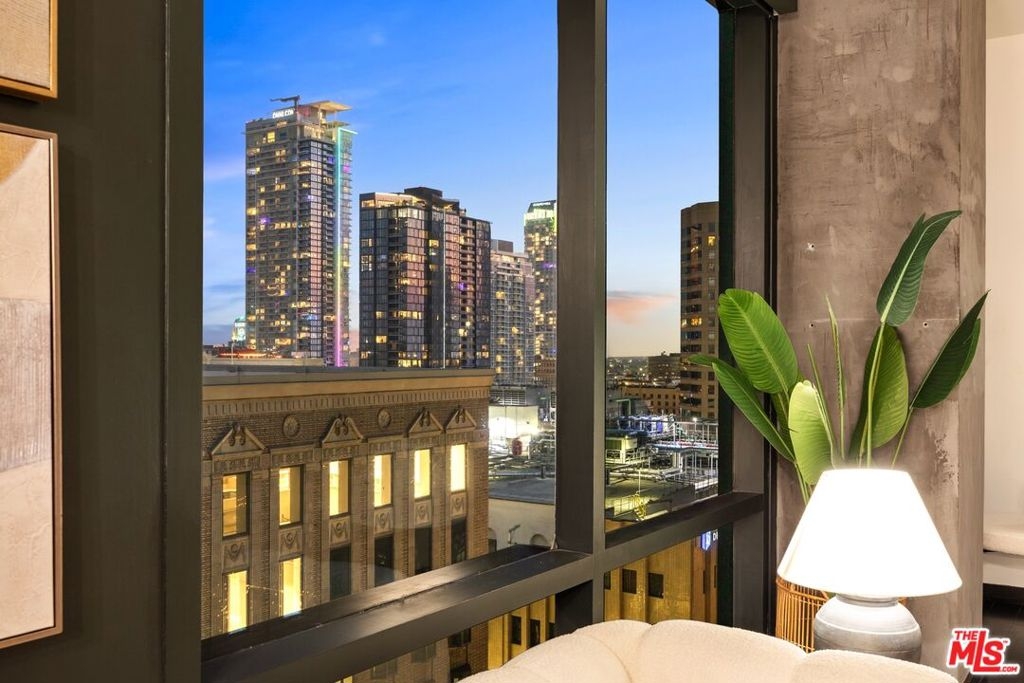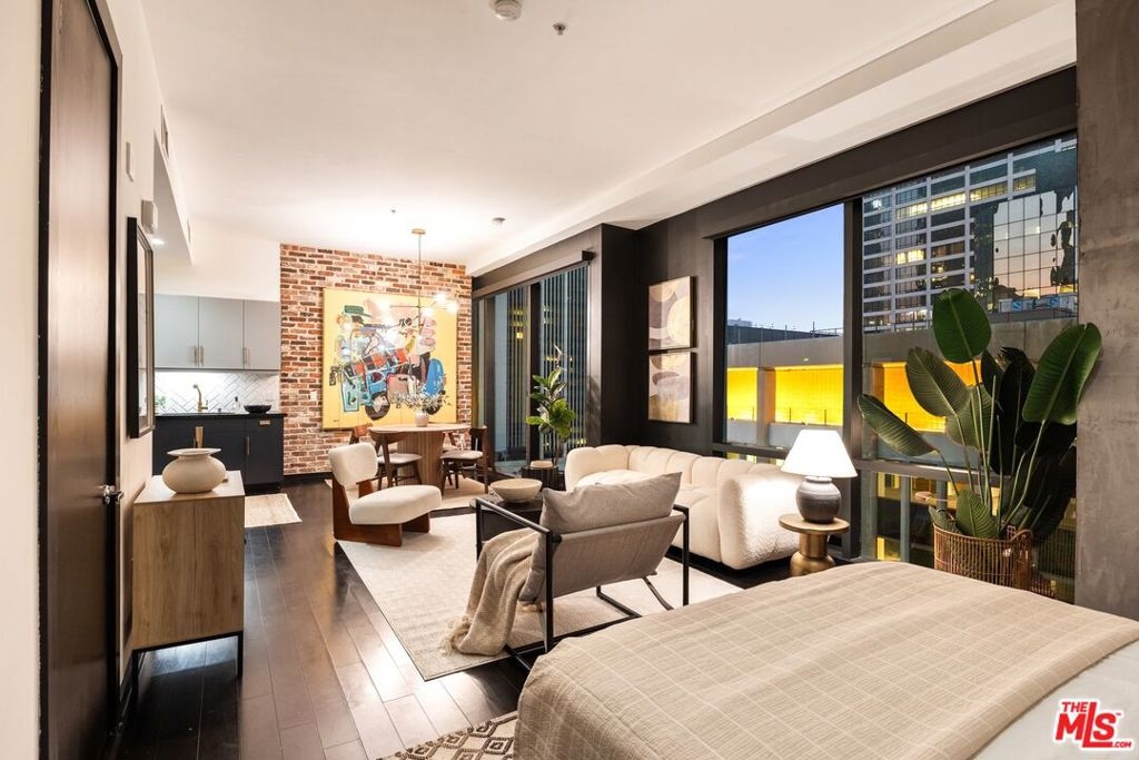 Nestled high on the 14th floor, the highly desirable end unit is a harmonious blend of modern elegance and urban sophistication. True urban dwelling with views of the bustling city down below. The open floor plan loft boasts floor-to-ceiling glass walls, tall gallery walls, 12-foot ceilings and warm dark hardwood floors. 2 unique brick accent walls and an East facing wall painted black. Natural light emanates throughout. The sleek kitchen features blue color cabinetry, white backsplash, granite countertops, stainless steel appliances and a new Bosch dishwasher. The bathroom features a soaking tub. Washer/dryer are included! 1 unassigned parking space included in the parking garage - exclusive to the Hope Street Lofts, with an elevator bank giving direct access to the 11th floor as well as the lobby. Hope Street Lofts is a boutique art deco condo building with only 80-units. Building amenities include 24/7 security, front desk concierge, a fitness center, gameroom, a rooftop with panoramic Downtown views, a helicopter pad, sundeck, barbecue grills and a chic wet bar. The rooftop was recently redone and new furniture has been ordered. The HOA fee covers water, trash, gas, sewage, 24/7 security and maintenance of the common areas. Located in the Financial District and directly above the 7th Street Metro Station. Access the best of urban dwelling at your doorsteps! Enjoy the best of food and beverages at the trendy Javiers or Bottega Louie. Near michelin star restaurants, world class museums, concept coffee shops and endless entertainment options. Across the street from the Bloc and Joeys. Only 2 blocks from Whole Foods and the Broad Museum is a stone's throw away. Experience a night at the LA Opera or a concert at the Walt Disney Concert Hall - only 4 minutes away. Attend a Lakers game at Crypto Arena. Entertain family and friends at LA Live. Easy access to freeways and public transportation. Truly, the best location in Downtown L.A.