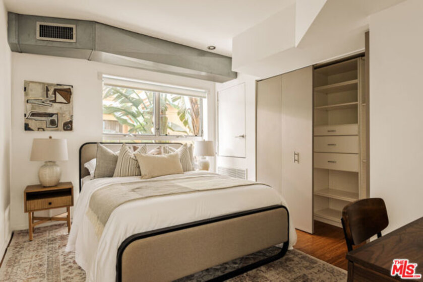 Residing in one of Los Angeles' most centrally located neighborhoods, this creative architectural loft is accentuated by an open-concept, contemporary design. Nestled in a prime back corner spot in the building - away from the street and high above ground level - this residence delivers as a serene, private, and secure retreat. Bamboo hardwood floors, soaring ceilings, and oversized windows create a juxtaposition of warmth against exposed industrial ducting. Anchoring the living area, the well-appointed kitchen and dining space flow seamlessly out to an oversized balcony, perfect for entertaining. Upstairs, a large mezzanine-style bedroom features windows overlooking the main level, offering a sense of openness while maintaining separation. On the main level, a second bedroom provides the ideal space for a home office, creative studio, or additional sleeping quarters. With two modern bathrooms, ample storage, and an in-unit washer and dryer, this space offers both form and function. Beyond the unit, enjoy sweeping views from the shared rooftop terrace - a hidden gem ideal for lounging, entertaining, or watching the city come to life. Parking is never an issue with two assigned garage spots in addition to multiple guest spaces. All of this, just moments from some of the most iconic restaurants, theaters, nightlife, and studios.