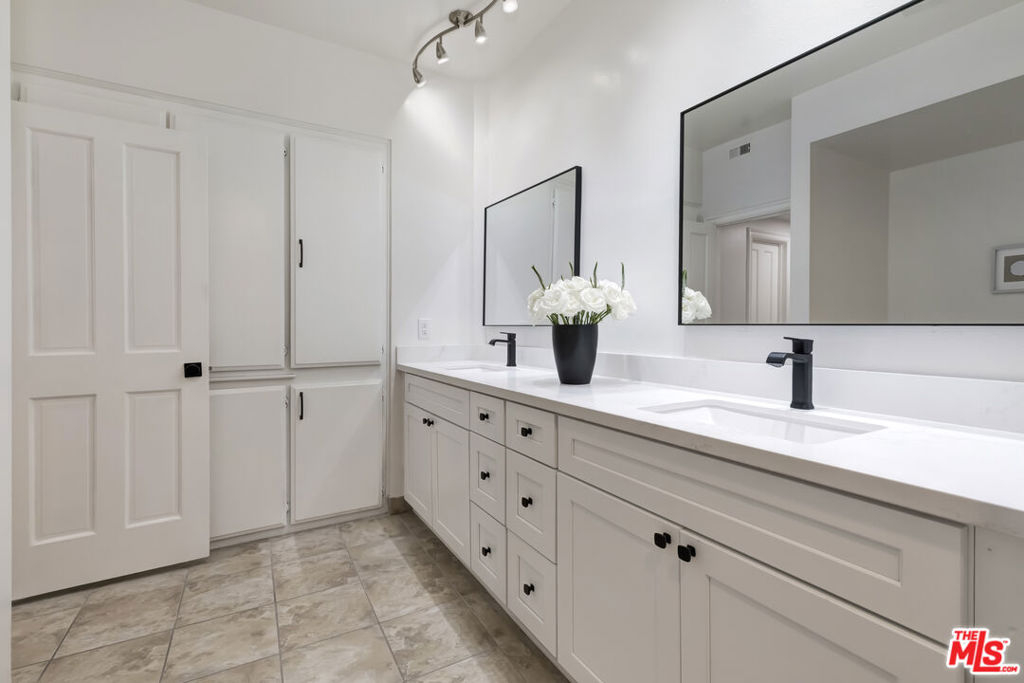 Tucked away in a quiet, rear-facing position in a secure building near South Beverly Hills, this beautifully upgraded residence in Pico-Robertson offers privacy, scale, and sophisticated living. An expansive formal entry introduces a refined interior featuring wide-plank luxury vinyl flooring with acoustic underlay, restored oak cabinetry, crown molding, and smart-home features including a DoorBird intercom, Ring doorbell, and mobile-accessible building cameras.The sunlit living room is anchored by a limestone fireplace with matte black accents and flows seamlessly into the dining area, which enjoys skyline and sunrise views. The chef's kitchen has been reimagined with quartz countertops, soft-close drawers, porcelain tile floors, top-tier appliances, a Ruvati sink with Moen faucet, water filtration system, and two oversized pantriesincluding one large enough to accommodate a 48" refrigerator. A mirrored wet bar with matching finishes enhances the home's entertainment appeal.The primary suite spans over 400 square feet with two large walk-in closets and tranquil bamboo views. Its spa-like bath includes an 8-foot quartz vanity, Jacuzzi-style soaking tub, rainfall shower with new doors and hardware, matte black finishes, and extensive storage. The guest bedroom features custom built-ins and a full closet, while the adjacent bath offers a deep soaking tub, rain shower, and power flush toilet.Additional highlights include a fully serviced HVAC system, all new plumbing shut-off valves, rewired electrical, full-size washer and serviced dryer, and custom mini blinds throughout. The unit includes two non-tandem parking spacesone EV-compatibleand convenient guest parking. Spectrum internet, hardwired Ethernet, and landline jacks are available.Set in a prime location with every detail considered, this residence blends comfort, technology, and classic design in one of LA's most desirable neighborhoods.