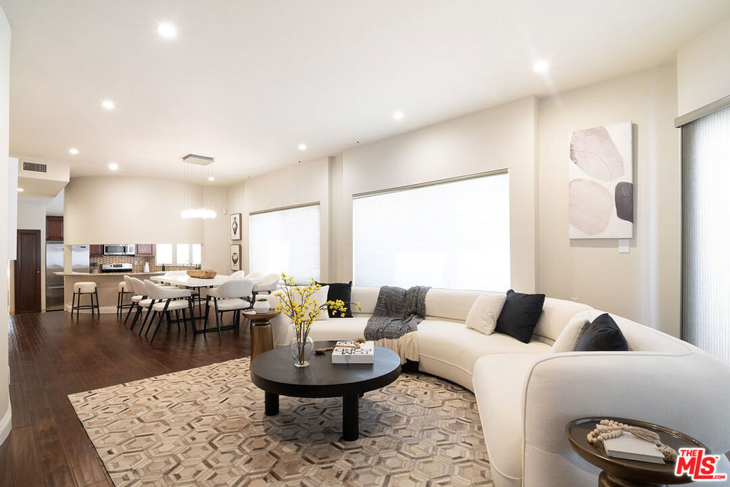 Located on a quiet, tree-lined street in a boutique 6-unit building, this spacious 2-bedroom, 2-bath condo offers nearly 1,500 square feet of well-designed living. The oversized primary suite features soaring ceilings, a massive bedroom, and a spa-like bathroom with dual vanities, a walk-in shower, soaking tub, and a private toilet room. The second bedroom is also large and bright, with high ceilings and direct access to the second full bath. An open-concept living and dining area with wide-plank hardwood floors sets the stage for entertaining, while the separate kitchen offers generous counter space, real wood cabinetry, and ample storage. Additional highlights include in-unit laundry, central HVAC, and two private patios ideal for dining or relaxing outdoors. Set between Beverly Hills and Pico-Robertson, this move-in-ready home delivers comfort, scale, and privacy in one of LA's most convenient neighborhoods!